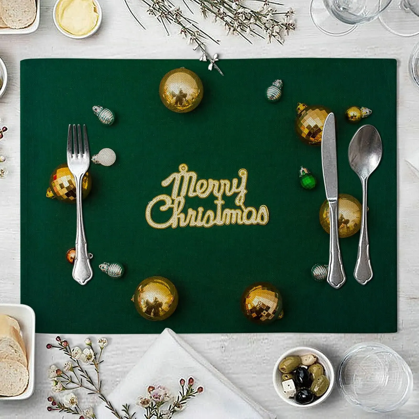 Gewöhnlich versandfertig in 2 bis 3 TagenKnSam Platzdeckchen Abwaschbar Kinder 8Pcs Set, Weihnachtsdekoration Glocken Tischsets Baumwolle Leinen, Abgrifffeste Hitzebeständig Platz-Matten Grün Gold für Restaurant Speisetisch, 32x42cm