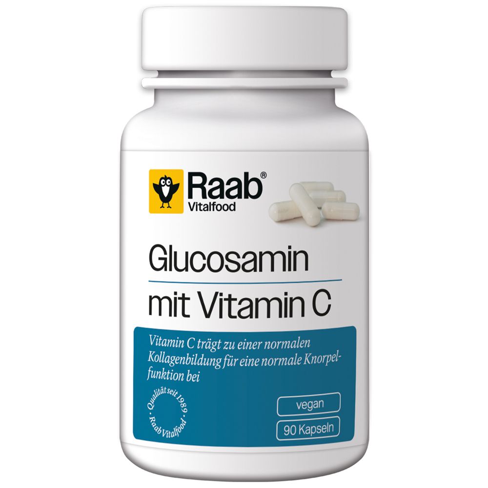 0,20 €/Stück - Kategorie: Nahrungsergänzungsmittel - Tetesept - GTIN:4008491277242 - PZN:16785339 - Nahrungsergänzungsmittel sind kein Ersatz für eine ausgewogene und abwechslungsreiche Ernährung und eine gesunde Lebensweise.tetesept Glucosamin 1200tetesept Glucosamin 1200 enthält hochdosiertes Vitamin D3 und Vitamin C sowie 1200 mg Glucosaminsulfat-KCl, ergänzt um weitere ausgewählte Mikronährstoffe. Das Vitamin C trägt zu einer normalen Kollagenbildung für eine normale Knorpel- und Knochenfunktion bei, während Vitamin D3 zur Erhaltung einer normalen Muskelfunktion und normaler Knochen beiträgt. Gleichzeitig leisten Vitamin C, E und Zink einen Beitrag dafür, die Zellen vor oxidativem Stress zu schützen. Kupfer schließlich trägt zur Erhaltung von normalem Bindegewebe bei. Mit hochdosiertem Vitamin D3 und Vitamin C sowie 1200 mg Glucosaminsulfat-KCl ergänzt um weitere ausgewählte Mikronährstoffe Vitamin C unterstützt den Knorpel. Vitamin D3 trägt zum Erhalt der Knochen bei 1 x täglich Gesunde, funktionsfähige Knorpel und Knochen sind eine wichtige Voraussetzung für einen intakten Bewegungsapparat, speziell in den GelenkenZutaten :Glucosaminsulfat Kaliumchlorid (Krebstiere, Weichtiere)(66,3%); Füllstoff: Mikrokristalline Cellulose; Ascorbinsäure (Vitamin C); Stabilisator: Polyvinylpyrrolidon; überzugsmittel: Hydroxypropylmethylcellulose; Farbstoff: Calciumcarbonat; Füllstoff: Natrium-Carboxymethylcellulose; Trennmittel: Magnesiumsalze der Speisefettsäuren; öl pflanzlich ... Dieses Produkt ist eine gute Wahl für den Einstieg, da es reines Glucosamin in Kapselform zu einem sehr günstigen Preis bietet. ![]() Raab Vitalfood Glucosamin Kapseln 90 St