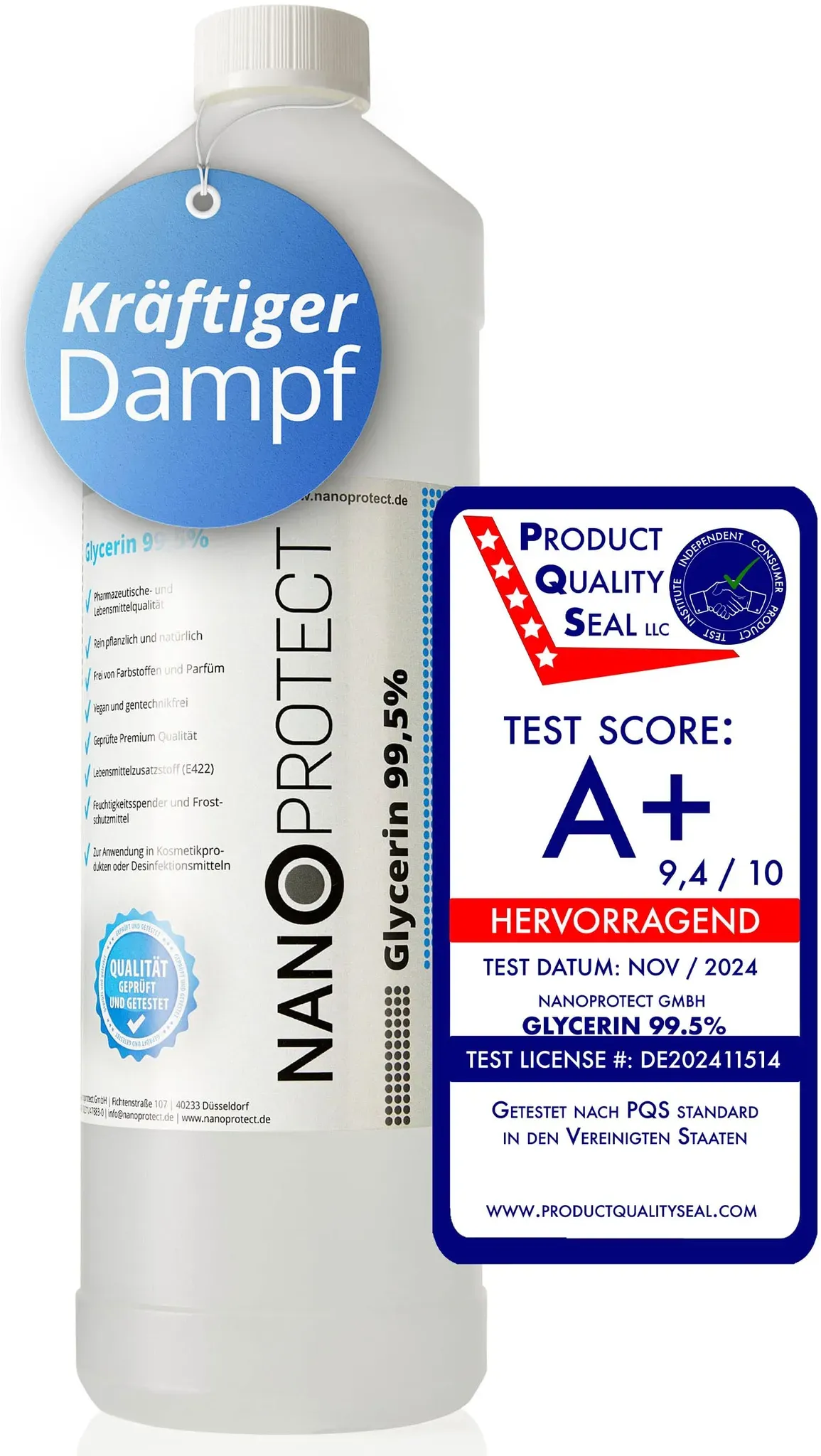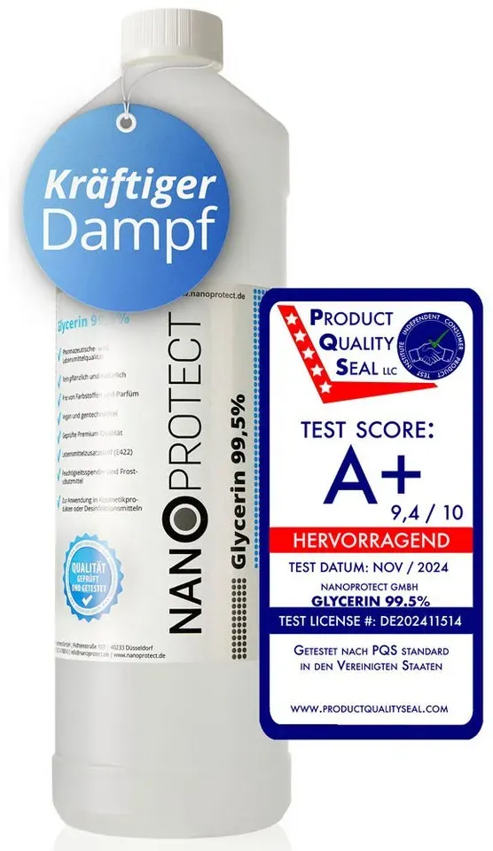 Zustand: Gebraucht - Laborchemikalien - LANGGI LANGGI Commerce GmbH - SKU002 - EAN: 4270004125917 - 🚀 Perfekte Basis: NebelHeld Glycerin 1L ist eine hochreine, farb-, geruch- und geschmacklose Flüssigkeit, das durch seine vielseitigen Anwendungsbereiche überzeugt. 💨 Extra dichte Nebelentwicklung: Die molekularen Eigenschaften des NebelHeld Glycerin 1L machen es zur perfekten Basis für extra dichten Dampf und Nebel - auch als VG Base. 🌿 Nur 2 Inhaltsstoffe: Das NebelHeld Glycerin besteht zu 99,5% aus Glycerin (gewonnen aus Pflanzenölen) und der Rest ist Wasser. Es ist also vegan, GMO-frei, schadstofffrei, ohne Soja hergestellt und damit rein pflanzliches Glycerin in Lebensmittelqualität. 🫶🼠Gratis Messbecher: Jede NebelHeld Glycerin Bestellung wird mit einem kleinen Messbecher, der auf den Deckel passt, geliefert - für einfaches Dosieren eurer Mischungen! 🇩🇪 Made in Germany: NebelHeld Glycerin wurde unter strengsten Qualitätsstandards (ISO- und HACCP-Zertifizierungen) in Deutschland produziert, abgefüllt und hat die bestmögliche Pharma-Qualität. 🦠Lebensmittelqualität: Unser Glycerin ist 100% pflantlich und perfekt für die Herstellung von Lebensmitteln oder auch Kosmetik geeignet. 💪 Sichere Flasche: Unsere Produkte werden ausschließlich in BPA-freien, transportsicheren, lichtgeschützten & lebensmittelechten Apothekerflaschen mit Originalitätssiegel verschickt - Spitzenqualität & Haltbarkeit rt! - 1 Händler im amazon.de Marketplace ![]() ![]() Nanoprotect Glycerin 99,5% | 1 Liter (1,25 kg) | Pharmaqualität und Lebensmittelqualität E422 | Rein pflanzliches Glycerol | flüssig | Glyzerin - Made in germany