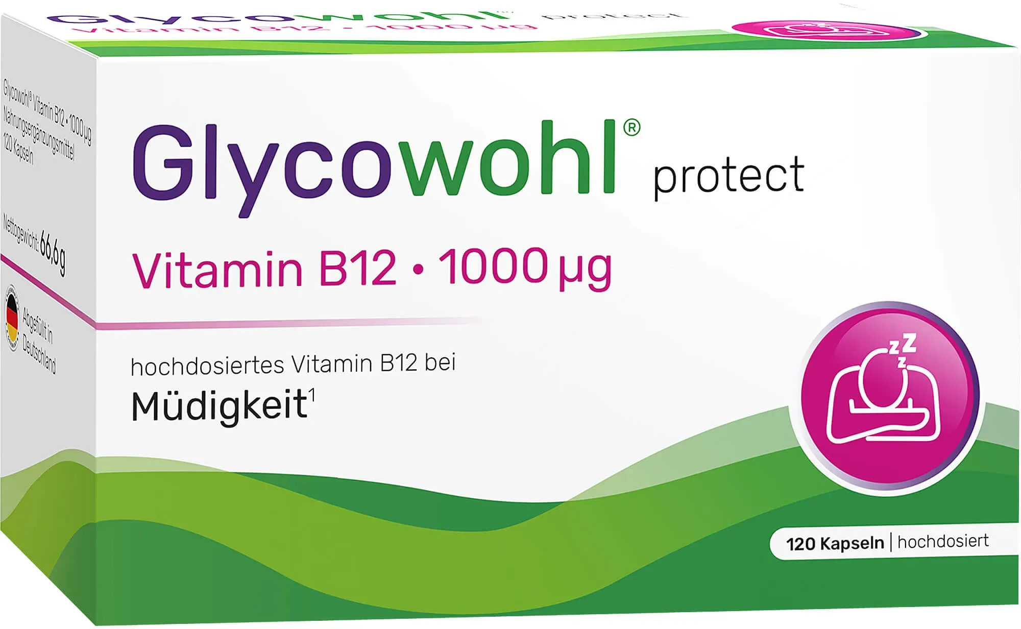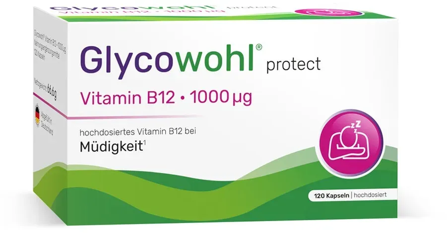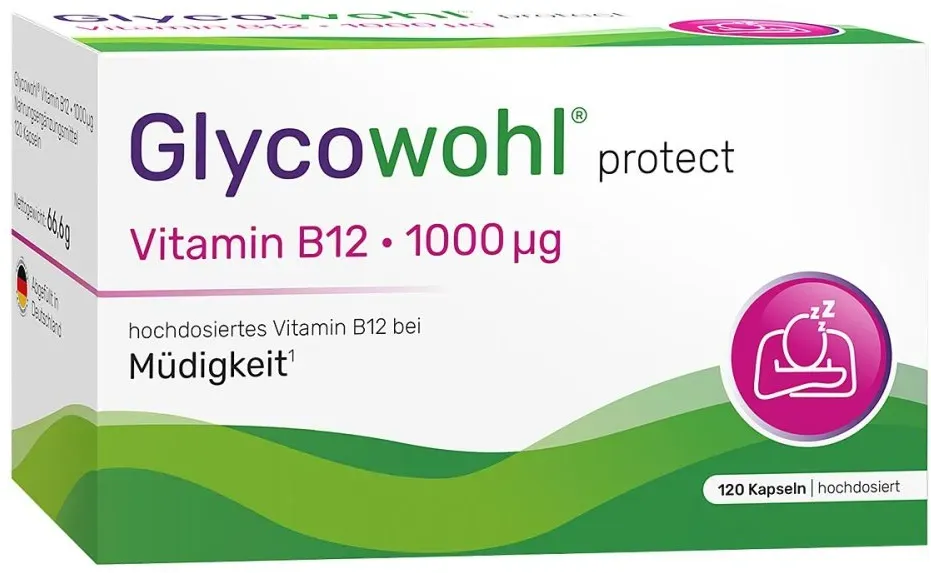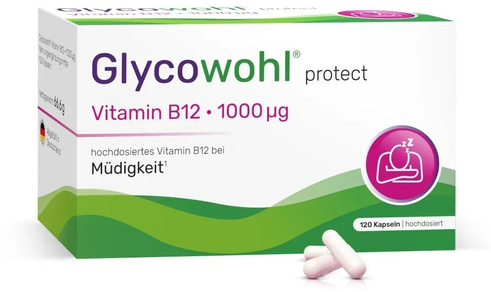 Glycowohl - EAN: 4260471893730 - Nahrungsergänzungsmittel sind kein Ersatz für eine abwechslungsreiche und ausgewogene Ernährung und eine gesunde Lebensweise.Hochdosierte Vitamin B12 Kapseln bei Müdigkeit und Ermüdung* Glycowohl protect Vitamin B12 1000 g ist ein veganes Nahrungsergänzungsmittel und enthält hochdosiertes Vitamin B12 in Apothekenqualität. Die 1000 g setzen sich dabei aus den drei natürlichen Vitamin B12 Formen Methylcobalamin, Adenosylcobalamin und Hydroxocobalamin zusammen. Vitamin B12 ist ein lebenswichtiges Vitamin, das eine zentrale Rolle im menschlichen Körper spielt und maßgeblich Müdigkeit und Ermüdung verringert.* Der enthaltene Inhaltsstoff überzeugt: Höchstdosiert mit 1000 g Vitamin B12 Verringert Müdigkeit und Ermüdung* Vorteilspackung: 4-Monats-VorratRezeptfrei erhältlich.Wie wirkt Glycowohl protect Vitamin B12 1000 g?Glycowohl protect Vitamin B12 1000 g ist ein hochdosiertes Nahrungsergänzungsmittel in Apothekenqualität, das unter dem Dach der bekannten Diabetesmarke Glycowohl geführt wird. Glycowohl protect Vitamin B12 1000 g - Alle Vorteile auf einem Blick: 1. Höchstdosiert mit 1000 g Vitamin B12 Die 1000 g Vitamin B1 von Glycowohl stellen die ausreichende Versorgung des Körpers sicher und verringern dadurch Müdigkeit und Ermüdung. Durch die hohe Dosierung wird das körpereigene Vitamin B12 Depot nachhaltig aufgefüllt und die wesentlichen Prozesse im Körper rund um die Uhr unterstützt.2. Verringert Müdigkeit und Ermüdung* Glycowohl Vitamin B12 ... ![]() ![]() Heilpflanzenwohl Glycowohl Vitamin B12 1000 g 120 stk