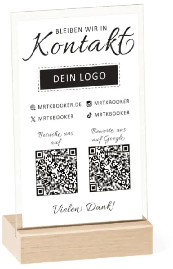 Gewöhnlich versandfertig in 4 bis 5 Tagenmrtkbooker Aufsteller Google, Webseite & Social Media | Acryl Aufsteller QR-Code deutsch (Logo oberhalb) personalisierbar 13x20 cm inkl. Holzfuss