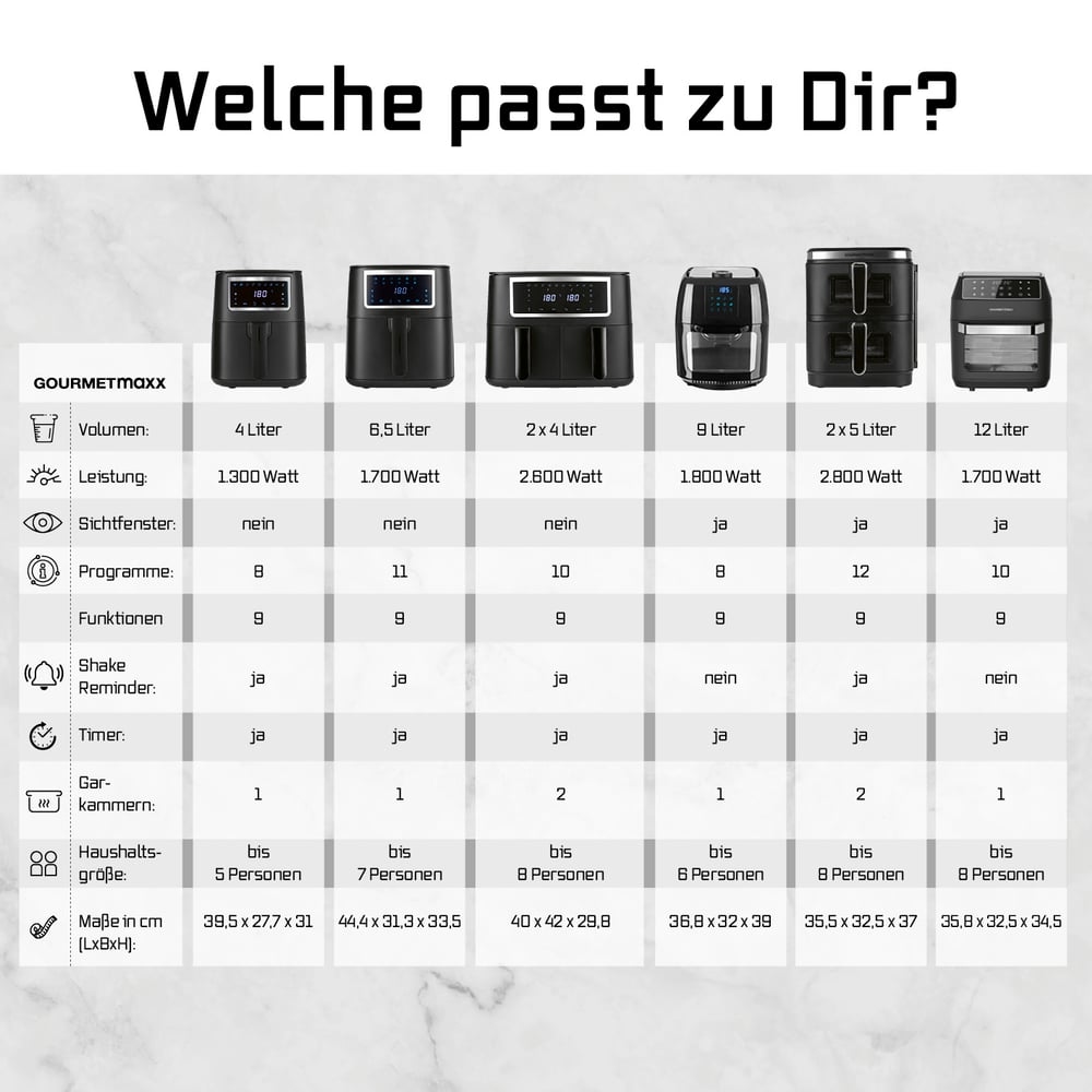 Gourmetmaxx heißluft-fritteuse META PreisvergleichMit dem Meta-Preisvergleich suchen Sie gleichzeitig bei den großen Preisvergleich Portalen!Jetzt live Suche nach gourmetmaxx heißluft-fritteuse starten! Gourmetmaxx heißluft-fritteuse KaufberatungWichtige Kaufkriterien für GOURMETmaxx HeißluftfritteusenBeachten Sie bei der Anschaffung einer GOURMETmaxx Heißluft-Fritteuse vor allem Fassungsvermögen (z. B. 4,5 L für 1-2 Personen oder 10-12 L für Familien), Leistung (1400-2800 W für schnelle Erhitzung), Anzahl der Programme/Funktionen (bis zu 12 Programme für Vielseitigkeit) und Reinigung (spülmaschinenfest). Achten Sie auf Doppelkammer-Design für gleichzeitiges Garen zweier Gerichte, Touchdisplay für einfache Bedienung und Energieeffizienz im Vergleich zum Ofen. Nachteile wie lange Garzeiten (z. B. bei Pommes), anfängliche Gerüche oder Lautstärke treten bei manchen Modellen auf[1][3][5].[2] Beliebte Merkmale, Modelle und Marken