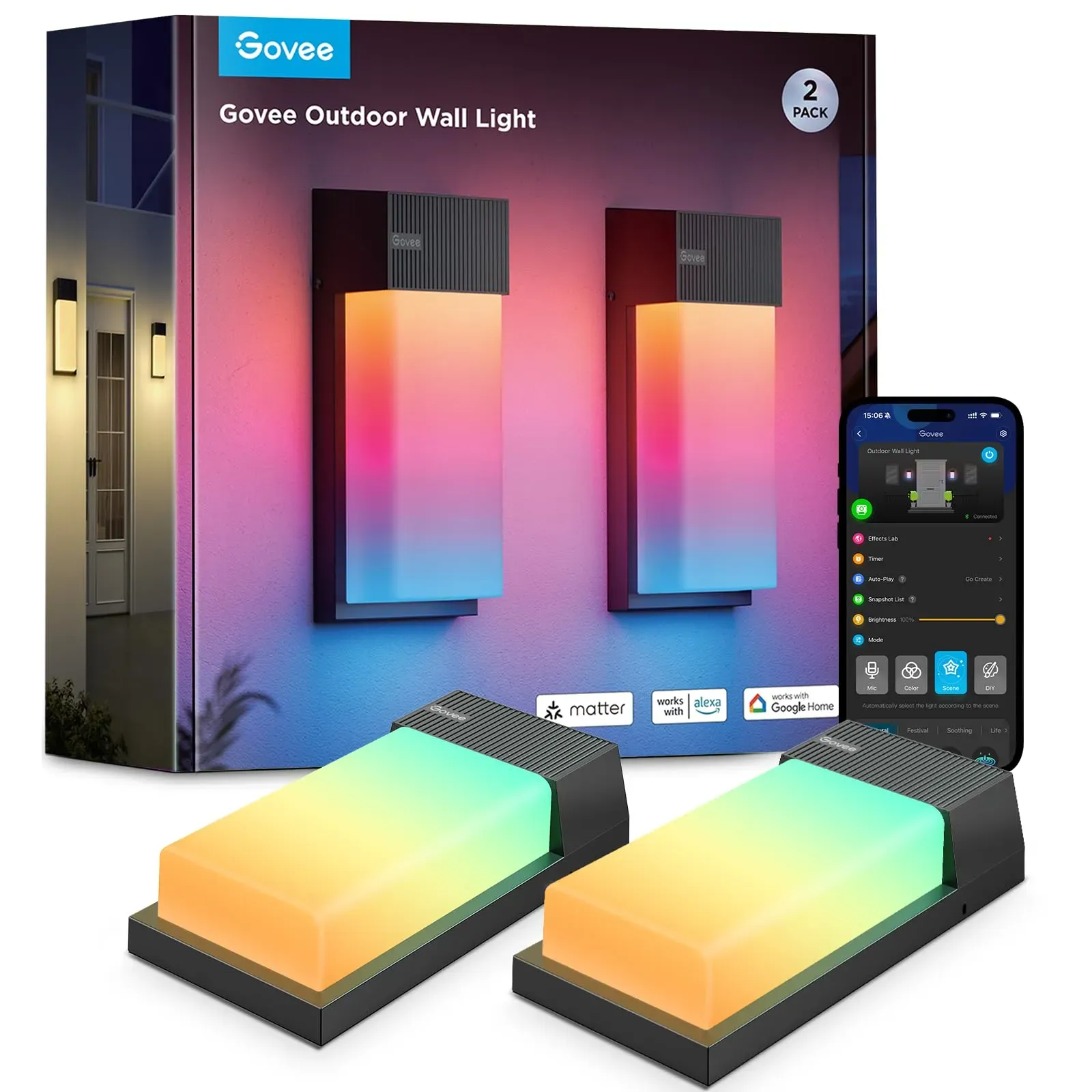 Auf Lager Versand durch AmazonGovee Outdoor Wandleuchte RGBIC, 1500LM Smart LED Wandleuchte Aussen mit 45 Scene Modes, IP65 Wasserdicht für Wandlampe, DIY Wandleuchte, Funktioniert mit Alexa, Google Assistant und Matter, 2 Stück