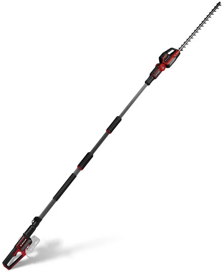 Einhell - EAN: 4006825681888 - Die Einhell Professional Akku-Teleskop-Heckenschere GP-HH 18/50 Li T BL-Solo ist ein zuverlässiges Gerät für die regelmäßige Pflege von hochgewachsenen Hecken und Büschen. Die Akku-Stab-Heckenschere ist Mitglied der Einhell Power X-Change Familie und kann mit allen Akkus und Ladegeräten der Systemreihe kombiniert werden. Angetrieben wird das Gerät von einem Einhell Brushless Motor. Dieser bürstenlose Motor bietet mehr Kraft und eine längere Laufzeit als herkömmliche Kohlebürsten-Motoren. Nach einer Online-Registrierung gelten 1 auf den Brushless-Motor. Der Teleskopstiel ist werkzeuglos für eine gesamte Gerätelänge zwischen 220 und 290 cm verstellbar und verfügt über praktische Halteflächen mit Softgrip. Der Schneidkopf ist 8-fach neigbar und mit lasergeschnittenen, diamantgeschliffenen Messern aus Stahl mit 50 cm Schnittlänge und 25 mm Zahnabstand ausgestattet. Das robuste Metallgetriebe sorgt für eine hohe Lebensdauer. Zum sicheren Transport und zur Aufbewahrung der Langstiel-Heckenschere wird ein Schutzköcher mitgeliefert. Für den Betrieb wird ein 18 V-Akku benötigt, der durch den Stahlrahmen am Ende des Teleskopstiels vor Stößen geschützt wird. Die Lieferung erfolgt ohne Akku und Ladegerät, diese sind separat erhältlich., Produktdetails: Funktionen: Teleskopstiel stufenlos arretierbarer, Kompatible Akkus / Akkusysteme: Einhell Power X-Change, Maße & Gewicht: Gewicht: 4,15 kg, Gesamtlänge maximal: 2,9 m, Schwertlänge: 55 cm, Technische ... ![]() ![]()