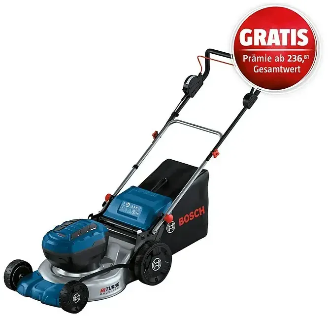 Bosch - EAN: 4059952654812 - Der Akku-Rasenmäher GRA 18V2-46 Professional mit BITURBO-Technologie von Bosch ist ein leistungsstarker und zuverlässiger Rasenmäher zur Pflege größerer Rasenflächen. Sein starker bürstenloser Motor läuft mit zwei 18V-Akkus, wie sie auch in den Akku-Werkzeugen verwendet werden und sorgt für hohe Leistung, längere Laufzeit und eine lange Lebensdauer. Der klappbare Handgriff ermöglicht ein platzsparendes Zusammenklappen des Mähers zum leichten Transportieren und problemlosen Lagern, sogar in senkrechter Position. Sein ergonomischer Griff mit Softgrip und 2-stufiger Höheneinstellung unterstützt eine gesündere Körperhaltung und macht die Arbeit bequemer. Der Rasenmäher hat eine Schnittbreite von 46cm und bietet eine zentrale 6-stufige Schnitthöheneinstellung von 30 bis 70mm. Das Stahl-Mähdeck des Mähers ist extrem robust, es hält auch höhere Lasten aus. Der 60 Liter Textil-Grasfangkorb und der Mulchstopfen bieten die Flexibilität, entweder den Grasschnitt zu sammeln oder ihn als natürlichen Dünger für den Rasen zu nutzen. - bei alternate.de - aus Yadore Produktdaten bueroplus.de bietet eine Aktion für 458.14 Euro inklusive Prämie nach Registrierung, was einen Mehrwert bietet. ![]() AKTION: BOSCH Professional GRA 18V2-46 Akku-Rasenmäher 18,0 V für bis zu 1000 m , ohne Akku mit Prämie nach Registrierung