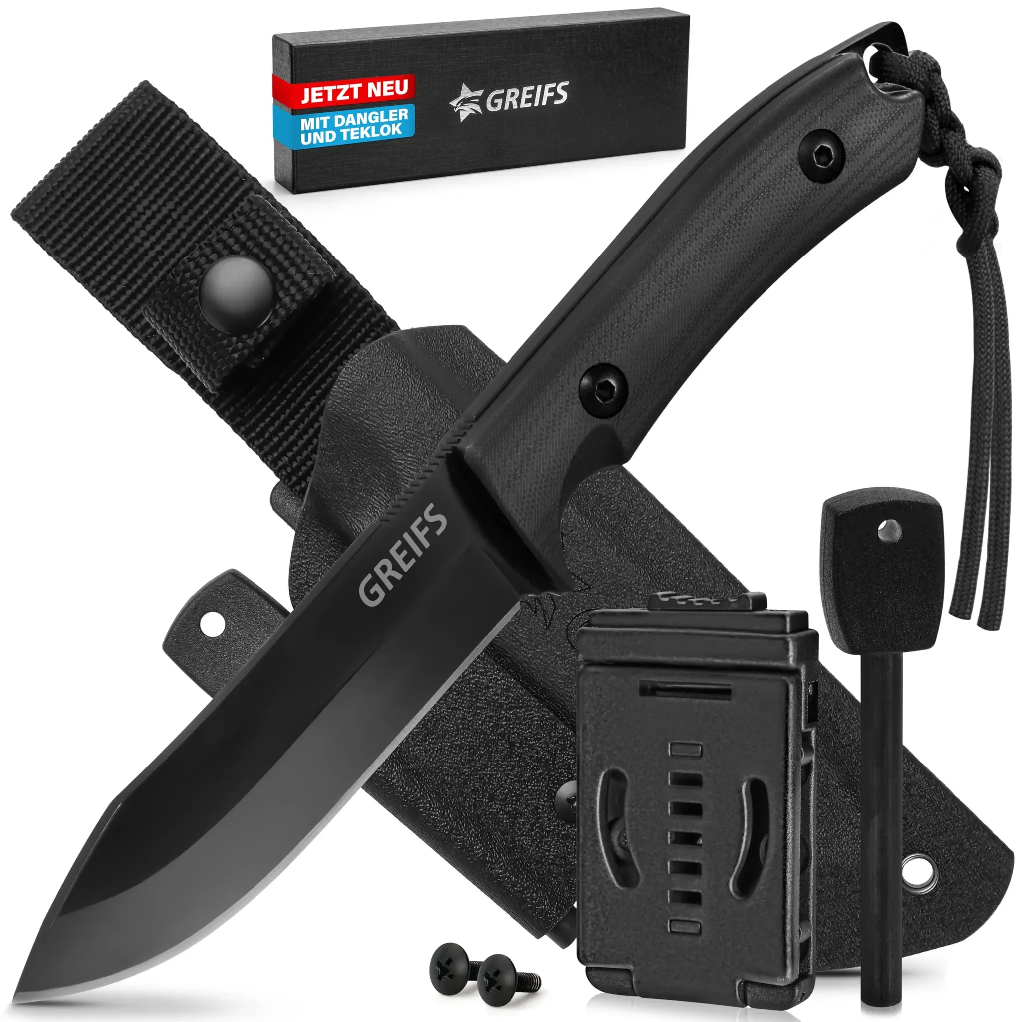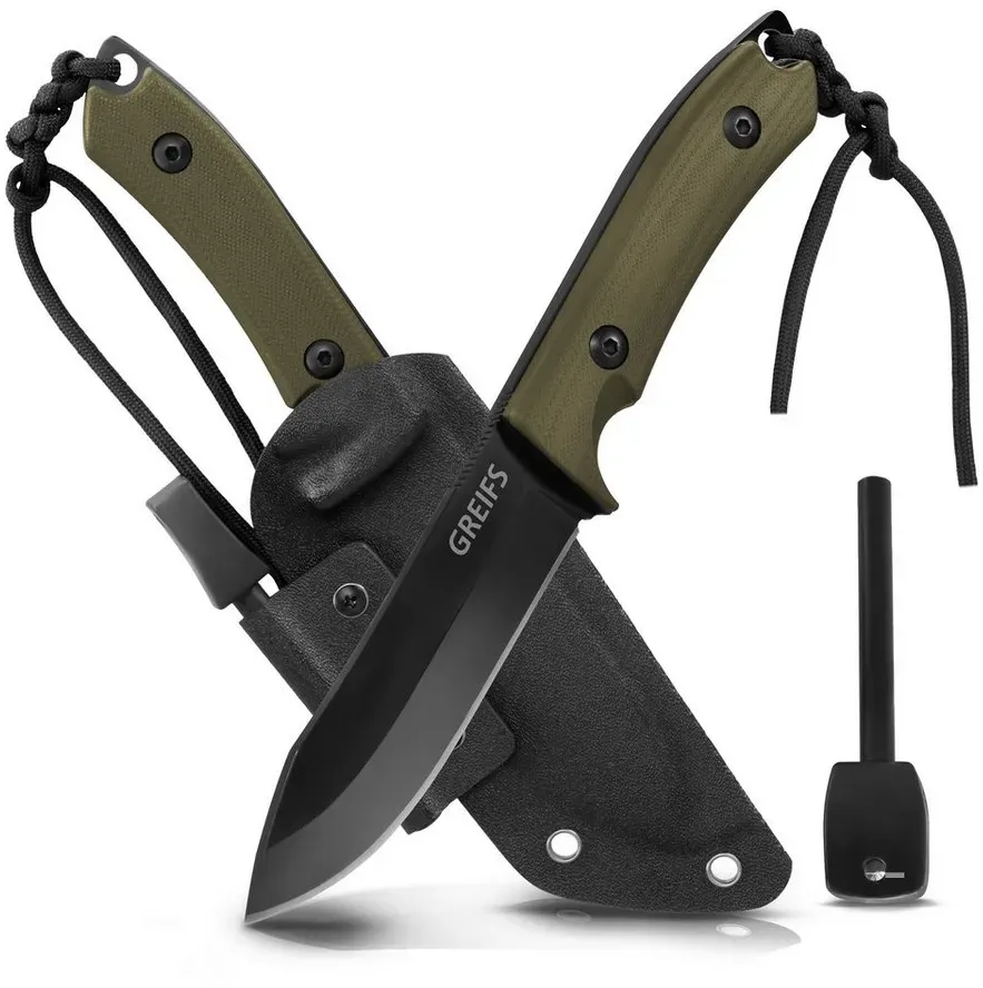 2 Händlerangebote bei billiger.de - Kategorie: Taschenmesser - greifs - Maße & Gewicht Gewicht , 250,00 g, Länge Griff , 12,00 cm, Stärke Klinge , 5,00 mm, Farbe & Material Farbe , schwarz, Material Griff , G10, - GTIN:4270002879928 ![]() ![]() GREIFS Outdoor-Messer aus D2 Stahl mit Kydex Holster und Feuerstahl, edles Survival Messer für die Bushcraft Ausrüstung, Jagdmesser, Schnitzmesser, Fahrtenmesser (Milan/Olivgrün)