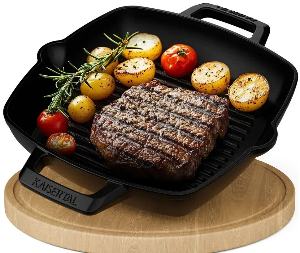 Gesamtsortiment Haushalt Küche Kochen + Zubereiten Kochgeschirr Pfanne + Kochtopf Töpfe & Pfannen - EAN:4008033660839 - Die Fackelmann Grillpfanne Statement ist ein vielseitiges Kochgeschirr, das sich ideal für die Zubereitung von gegrillten Speisen eignet. Mit einem Durchmesser von 28 cm bietet sie ausreichend Platz für verschiedene Zutaten und ermöglicht ein gleichmässiges Garen. Die Pfanne ist aus hochwertigem Keramikmaterial gefertigt, das nicht nur eine hervorragende Wärmeleitung gewährleistet, sondern auch eine einfache Reinigung ermöglicht. Die Keramikbeschichtung sorgt dafür, dass Lebensmittel nicht anhaften, was das Kochen und Servieren erleichtert. Diese Grillpfanne ist eine ausgezeichnete Wahl für alle, die Wert auf Qualität und Funktionalität in der Küche legen. - Hochwertige Keramikbeschichtung für eine einfache Reinigung und Antihaft-Eigenschaften - Robustes Material aus recyceltem Aluminium für eine umweltfreundliche Option - Eignet sich für verschiedene Kochmethoden, einschliesslich Induktion. - gefunden von Kelkoo Diese Kaisertal Gusseisen Grillpfanne ist induktionsgeeignet und kommt mit einem Rezeptbuch, was sie zu einem attraktiven Paket macht. ![]() ![]() Kaisertal Grillpfanne KAISERTAL Gusseisen Grillpfanne - 27cm Bratfläche - Induktionsgeeignet, Grillpfanne Induktion Gusseisenpfanne inkl. Rezeptbuch schwarz