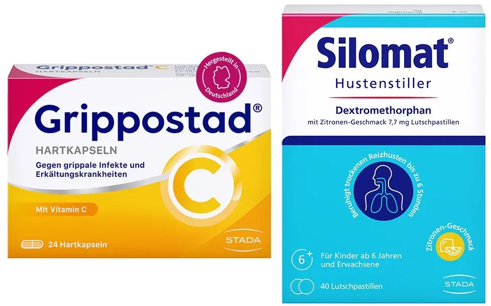 0.54 / stück - Kategorie: Arzneimittel - Grippostad - Stark bei grippalen Infekten: Die Kombination aus vier verschiedenen Wirkstoffen in der praktischen Kapsel bekämpft gleichzeitig auftretende Erkältungssymptome wie Fieber, Kopf- und Gliederschmerzen, Schnupfen und Reizhusten - 25,70 Euro bei Amazon Marketplace Health & Personal Care - gefunden von billiger.de Dieses Kombipackung für 27.29 Euro enthält Grippostad C Kapseln und einen Silomat Hustenstiller, ideal für umfassende Erkältungssymptome. ![]() ![]() STADA Grippostad C Kapseln + Silomat Hustenstiller DMP Zitronen-Geschmack 7.7mg 1 St Kombipackung