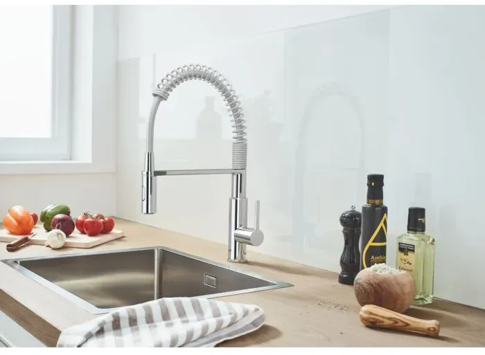 Grohe - EAN: 4005176472947 - Grohe Get Küchenarmatur 30361000 Einlochmontage GROHE Long-Life Oberfläche GROHE SilkMove 28 mm Keramikkartusche mit integriertem Temperaturbegrenzer Profibrause Umstellung: Laminarstrahl/SpeedClean Brausestrahl automatische Rückstellung auf Laminarstrahl schwenkbarer Auslauf Schwenkbereich 360 Eigensicher gegen Rückfließen flexible Anschlussschläuche QuickMount im Lieferumfang enthalten Holen Sie sich die Leistung einer Profi-Küchenarmatur nach Hause mit diesem eleganten und praktischen GROHE Get Einhebelmischer. Für volle Flexibilität lässt sich der Auslauf der Armatur sanft um 360 schwenken. Die vollbewegliche, gefederte Profi-Brause bietet Ihnen die Wahl zwischen einem kräftigen Brausestrahl und einem feinen Laminarstrahl, sodass Sie für jede Küchenarbeit gerüstet sind. Wenn Ihre Küche über eine Doppelspüle verfügt, sind diese beiden Funktionen ideal. Mit den flexiblen SpeedClean-Düsen aus Silikon können Sie den Brausekopf einfach mit dem Finger sanft abbürsten, um Kalkablagerungen zu entfernen. Der Hebel lässt sich leichtgängig bedienen, dank der GROHE SilkMove Keramikkartusche im Inneren, die Durchfluss und Temperatur präzise reguliert und so für jahrelangen störungsfreien Betrieb sorgt. Der integrierte Temperaturbegrenzer ist ein cleverer Energiesparer. Und die glänzende, langlebige GROHE Long-Life Oberfläche sorgt dafür, dass Ihre Küchenarmatur auch nach jahrelangem Gebrauch ihr makelloses Aussehen behält. Die Montage ist schnell und ... ![]() GROHE Get Einhand-Spültischbatterie mit Profibrause 30361000, Küchenarmaturen, chrom