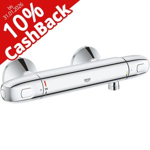 GROHE - EAN: 4005176309670 - . Aufputz-Thermostat aus Messing mit Sicherheitssperre . Wassersparend durch GROHE EcoJoy Technologie / Wasserverbrauch bei 3 bar (l/m): 25 Liter . Maße: (BxHxT) 31,7 x 7 x 9 cm . Mit einfach zu reinigender, langlebiger GROHE StarLight Oberfläche . Zur Wandmontage mit G 1/2 Zoll Duschschlauchanschluss . GROHE SafeStop Sicherheitssperre bei 38 C & GROHE SafeStop Plus optional einsetzbarer Temperaturendanschlag bei 43 C . GROHE CoolTouch mit Sicherheitsgehäuse verhindert das Erwärmen der Oberfläche . Ausgestattet mit integrierter Mischwasserabsperrung, Schmutzfangsieben & eingebautem Rückflussverhinderer . Mengengriff mit GROHE EcoButton - Spartaste mit individuell einstellbarem Sparanschlag . GROHE TurboStat Kompaktkartusche mit Dehnstoff-Thermoelement . GROHE MetalGrip - ergonomisch geformte Metallgriffe . Wassermenge und Temperatur über Drehregler justierbar . Lieferung inklusive 2 S-Anschlüsse, Dichtungen, 2 Wandrosetten & Montageanleitung Merkmale: Ausführung: mit Thermostat Montageart: Aufputz Farbe: verchromt Material: Messing, Metall Herstelleraktion: 10 % Cashback bei Registrierung unter http://www.markenmehrwert.com/campaign/grohe-colors-cashback sofern das Aktionsprodukt innerhalb des Aktionszeitraums erworben wurde (nur für private Endkunden, gültig für Käufe bis 31.01.2026, max. Abgabe in haushaltsüblichen Mengen, max. 1 Antrag pro Rechnung, Teilnahme einmalig pro Haushalt möglich, min. GROHE-Warenkorb 150 bis max. 3000 ). Im Falle ... ![]() ![]() GROHE Grohtherm 1000 Thermostat-Brausebatterie, chrom, FastFixation S-Anschlüsse, 34550000