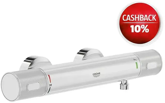 Verfügbarkeit: 2-5 Werktage - 135 €/Stück - Kategorie: Duscharmaturen - Grohe - GTIN:4005176613074 - Der Brausethermostat Precision Feel von Grohe bietet Qualität, hochwertige Technologie und ein modernes Design. Optisch glänzt der Thermostat mit der Grohe StarLight® Chromoberfläche und ergonomischen Metallgriffen. Die Grohe TurboStat® Technologie sorgt für ein komfortables Duscherlebnis und für die konstante Temperatur des Wassers über die gesamte Duschdauer hinweg. Mit Grohe EcoJoy und der Spartaste EcoButton können Sie den Wasserverbrauch mühelos reduzieren und die wertvollen natürlichen Ressourcen schützen. Die SafeStop-Funktion sorgt dafür, dass die Wassertemperatur nicht über 38°C ansteigt. Diese Begrenzung lässt sich allerdings jederzeit wieder aufheben. Dank GROHE CoolTouch® Technologie wird ein starkes Aufheizen der Oberfläche vermieden, so dass keine Gefahr von Verbrennungen entsteht. # Angebote & Aktionen # +++ *Aktion vom 15.09.-31.01.2026: 10% Cashback auf das gesamte Grohe Sortiment sichern! +++ Kaufen Sie im Zeitraum vom 15. Septemper 2025 bis zum 31. Januar 2026 Grohe Artikel im Wert von 150€ - 3000€ und erhalten Sie 10% Cashback. Wie löse ich die Cashback-Aktion ein? 1. Laden Sie Ihren Kaufbeleg bis spätestens 28.02.2026 unter https://www.markenmehrwert.com/campaign/grohe-colors-cashback/ hoch. 2. Füllen Sie das Teilnahmeformular aus und beantworten Sie die abschließenden Fragen. 3. Akzeptieren Sie die Teilnahmebedingungen und die ... Für 138.99 Euro erhalten Sie ein Duschset mit Thermostat und einer längeren 90cm Duschstange, ideal für größere Duschbereiche. ![]() ![]()