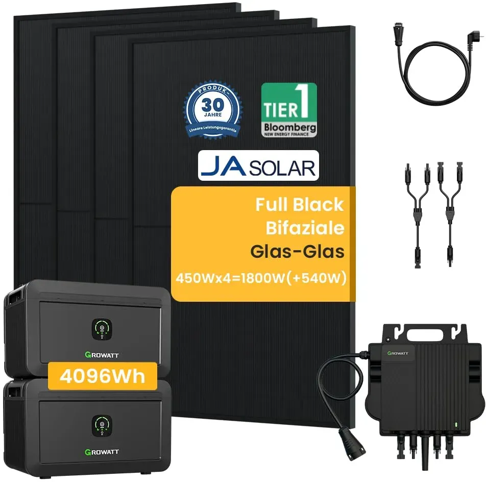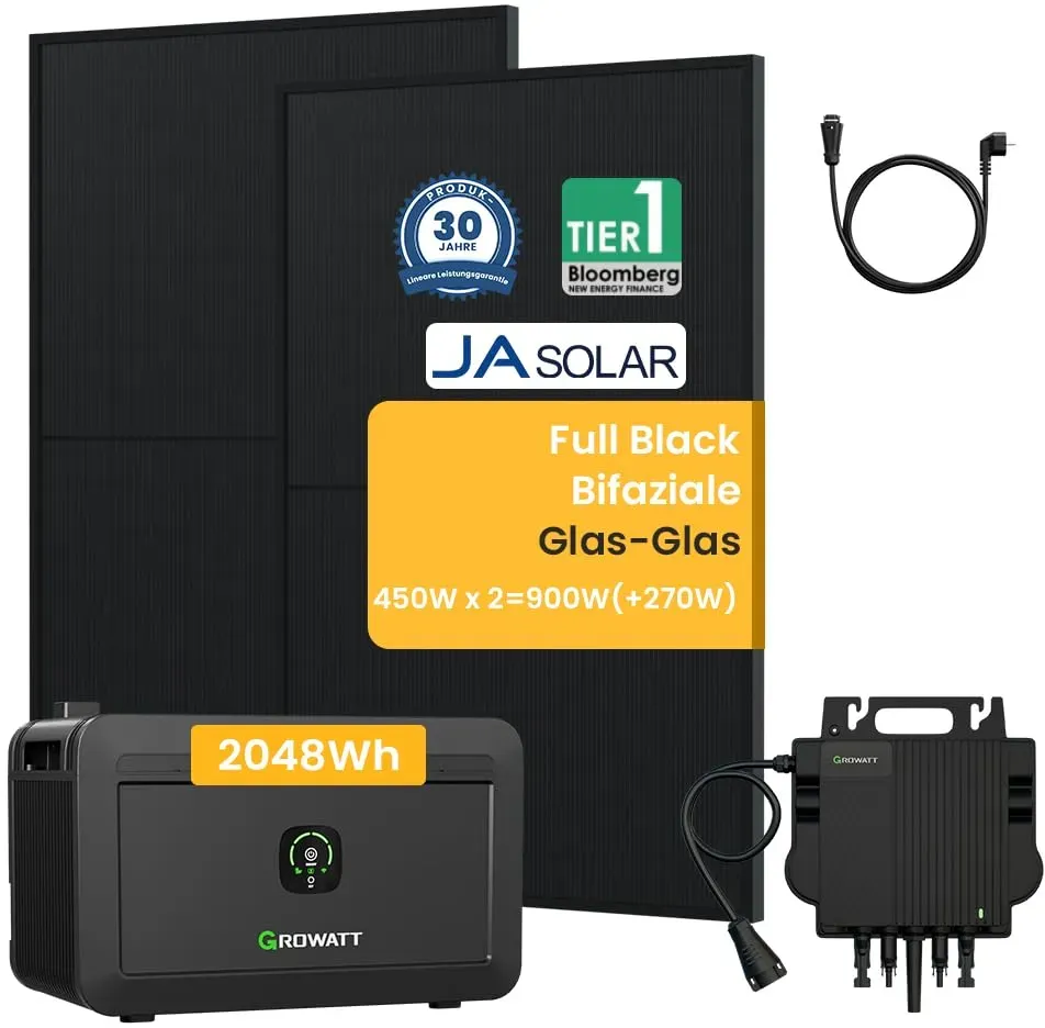 - - Vale Balkonkraftwerk Growatt, 860 W / 800 W - 2.048 Wh Balkonkraftwerk Die bifazialen monokristallinen N-Type Glas-Glas Panels nutzen auf die Rückseite reflektierendes Sonnenlicht, um bis zu 25% mehr Strom Leistung zu erbringen. Unsere monokristallinen Full Black Module von namenhaften Markenherstellern erreichen einen Wirkungsgrad von 21.5% bzw. bifazial bis zu 26.9% und gehören damit zu den aktuell Besten am Markt und punkten mit ihrer Eleganz und Simplizität. Der Growatt NEO 800M-X Mikro-Wechselrichter (einphasig, netzgeführt) erlaubt eine unkomplizierte, genehmigungsfreie Anmeldung bei einer maximalen Einspeiseleistung von bis zu 800Va. Die Installation ist kinderleicht. App-Steuerung Mit der smarten App hast du die erzeugte Strommenge sowie alle COâ‚‚-Einsparungen immer mühelos im Blick. Seine Zulassungen nach En50549, Vde0126, Vde4105, Iec62109 sichern einen legalen Betrieb, inkl. NA-Schutz und VDE-gerechter Schnellabschaltung bei Trennung von der Netzstromversorgung. Konstruiert nach Schutzart Ip65 und damit bestens gewappnet für den Außeneinsatz. Growatt Noah 2000 Solarenergiespeicher Ihr Balkonkraftwerk produziert mehr Energie, als Sie gerade verbrauchen? Mit der im Packet enthaltenen Solarbatterie speichern Sie diese Energie doch einfach! Mit diesem Batteriespeicherpacket laden Sie die Batterie aus der überschussproduktion auf und rufen Sie von dort in sonnenärmeren Zeiten wieder ab (z.B. nachts). Der zwischen Ihre Solarmodule und den Wechselrichter ... Ein erweitertes System mit 4096Wh Speicher und 1800W bifazialen Solarmodulen, ideal für Haushalte mit mittlerem bis hohem Verbrauch. ![]() ![]() powerness Balkonkraftwerk mit Speicher 4096Wh Growatt NOAH 2000 Speicher x2 mit 1800W PV-Eingangsleistung IP66 und Jasolar Bifaziale 1800W(+540W) Solarmodule für Balkonkraftwerk (NOAH 2000 * 2+NEO800W+1800W)