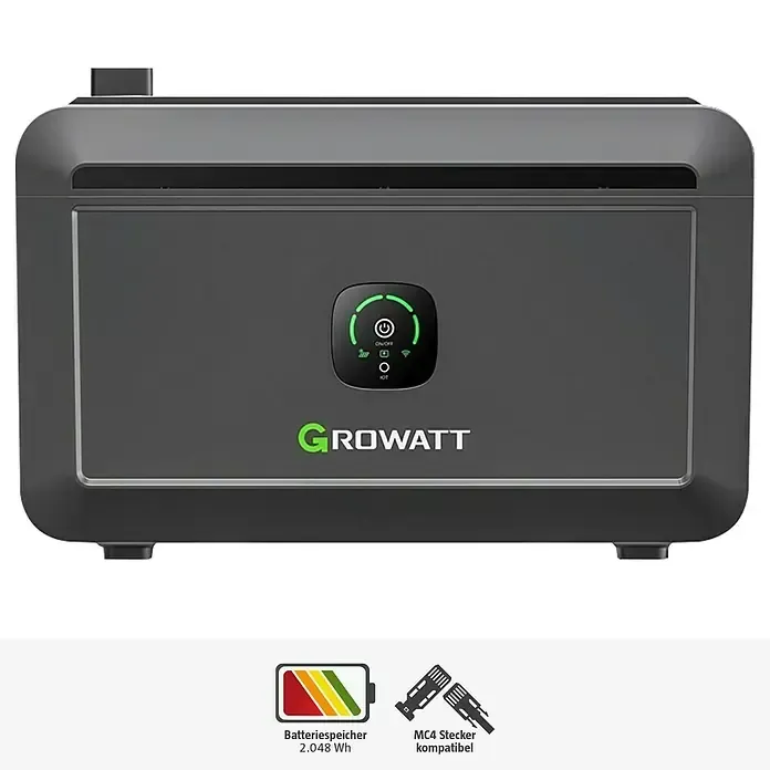 Kategorie: Stromspeicher - Growatt - GTIN:4068707000811 - Der Growatt NOAH 2000 Balkon Solar Speicher ist eine Revolution in der Welt der nachhaltigen Energie. Diese ultimative Balkon-Stromstation ermöglicht eine mühelose Installation und verspricht unendliche Energie, dank seiner hochkapazitiven 2048 Wh LiFePO4-Batterie. Mit der Möglichkeit, bis zu 4 Module zu erweitern, bietet dieser Solar Speicher eine beeindruckende Lebensdauer von 1 n und integriert sich nahtlos in bestehende Solarsysteme. Die Installation ist ein Kinderspiel und in nur 5 Minuten erledigt, während die robuste Bauweise mit IP66-Schutzklasse für Langlebigkeit sorgt. Mit der ShinePhone APP bleiben Sie stets informiert und behalten die Kontrolle über Echtzeit-Leistungsanalysen direkt auf Ihrem Smartphone. Einfache Einrichtung: Die Installation des Growatt NOAH 2000 Systems zeichnet sich durch ihre Einfachheit und Schnelligkeit aus, da es mit allen Mikro-Wechselrichtern arbeitet und für MC4-Stecker ausgelegt ist. Sie müssen lediglich den Mikro-Wechselrichter an einer Wand befestigen und dann mit einem Schnellverbinder eine Verbindung zur Batterie herstellen. Diese unkomplizierte Prozedur lässt sich innerhalb von nur 5 Minuten abschließen. # Hinweis zur Mehrwertsteuer Der angegebene Endpreis enthält bereits 0 % MwSt. gemäß 12 Abs. 3 UStG. Ein Kauf mit regulärem Mehrwertsteuersatz (19 %) ist über den Webshop aktuell nicht möglich. - 495,00 Euro bei BAUHAUS - gefunden von billiger.de Dieses Set bietet ein Balkonkraftwerk mit 870W Leistung, 2048Wh Speicher und 800W Microinverter, ideal für eine solide Grundversorgung. ![]() ![]() 870W Balkonkraftwerke Growatt NOAH 2000 2048WH Batteriesysteme mit 800W Microinverter und 5M AC Kabel