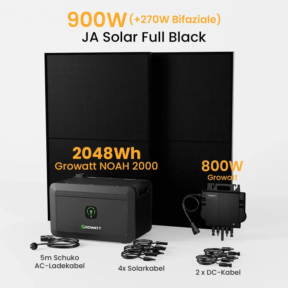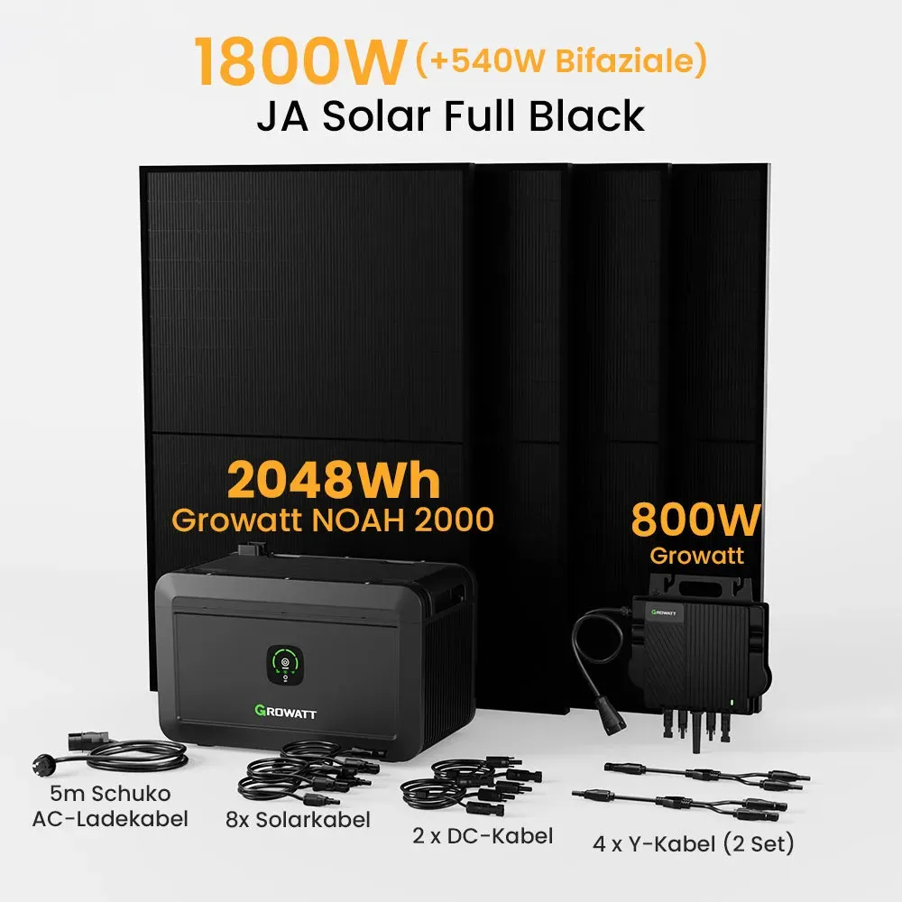 Gewöhnlich versandfertig in 2 bis 3 Tagenpowerness Balkonkraftwerk mit Speicher Growatt NOAH 2000 Speicher 2048Wh mit 1800W PV-Eingangsleistung IP66 und Jasolar Bifaziale 900W(+270W) Solarmodule für Balkonkraftwerk (NOAH 2000 * 1+NEO800W+900W)