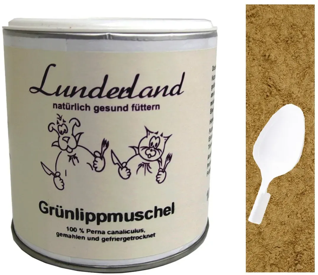 7 Händlerangebote bei billiger.de - Kategorie: Tiergesundheit - Lunderland - Lunderland - Grünlippmuschelpulver 100 % Perna Canaliculus Die Schale der Muschel wird vor der Verarbeitung entfernt, so dass das Pulver zu 100% aus gefriergetrocknetem und dann gemahlenem Muschelfleisch besteht. Es werden keine Füllstoffe oder Konservierungsmittel zugefügt. Einzelfuttermittel zur Nahrungsergänzung für Hunde und Katzen. Enthält ca. 2,4% natürliches Taurin Analytische Bestandteile: Protein: 64,5% Fettgehalt: 9,5% - GTIN:4250152110232 ![]() ![]() Knuffelwuff Grünlippmuschelpulver 100g