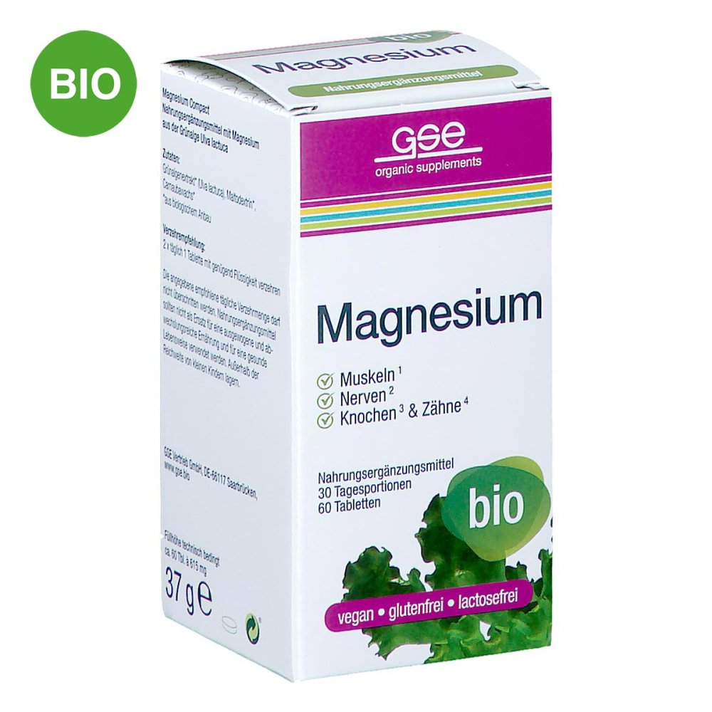15 Händlerangebote bei billiger.de - Kategorie: Arzneimittel - GSE - Magnesium Compact Bio Tabletten Nahrungsergänzungsmittel mit Magnesium aus der Grünalge Ulva lactuca 2 Tabletten täglich gmo-frei, laktosefrei, glutenfrei, sojafrei vegan Die Bedeutung von Magnesium im menschlichen Körper Der Mineralstoff Magnesium ist im menschlichen Körper an vielen Prozessen beteiligt , bei denen Energie gewonnen wird*. Nur mit Magnesium können die Körperzellen Energie produzieren. Außerdem spielt Magnesium eine wichtige Rolle für die Muskelfunktion*. Magnesium ist essenziell für die Bewegung des Muskelapparates , es ist aber auch für viele andere Aufgaben in unserem Körper von großer Bedeutung*. Im Zusammenspiel mit anderen wichtigen Elektrolyten und Nährstoffen ist es zum Beispiel an der Erregungsübertragung von den Nerven auf die Muskeln beteiligt*. Da der menschliche Körper Mineralstoffe nicht selbst bilden kann, müssen wir Magnesium in ausreichender Menge über die tägliche Ernährung oder eine hochwertige Nahrungsergänzung zu uns nehmen. * Magnesium trägt zu einer normalen Muskelfunktion , einer normalen Funktion des Nervensystems , zur Erhaltung normaler Knochen , zur Erhaltung normaler Zähne , zu einem normalen Energiestoffwechsel , zur Verringerung von Müdigkeit und Ermüdung , zu einer normalen Eiweißsynthese , zum Elektrolytgleichgewicht , zur normalen psychischen Funktion bei und hat eine Funktion bei der Zellteilung - GTIN:4035784161155 - PZN:12477440 ![]() ![]() Gse Magnesium Compact Bio 60 ST
