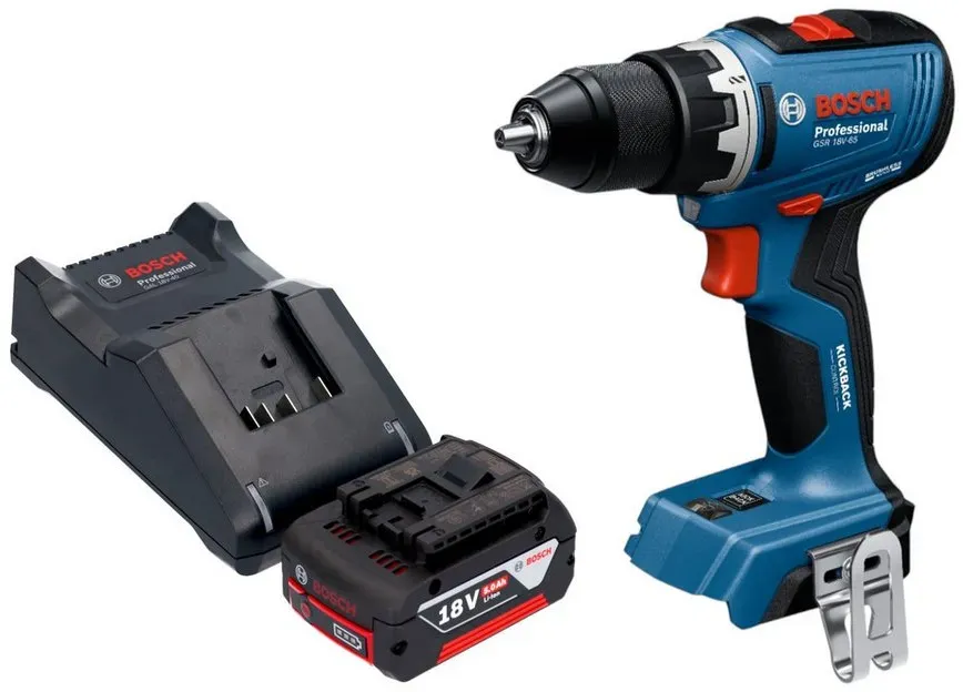 Kategorie: Akkuschrauber - Bosch - GTIN:4064677164690 - Der Bosch GSR 18V-65 Professional Akku Bohrschrauber ist ein leistungsstarkes Werkzeug, das für anspruchsvolle Bohranwendungen konzipiert wurde. Mit einem maximalen Drehmoment von 63 Nm und einer variablen Drehzahl von 0-550/0-2100 U/min bietet dieser Bohrschrauber die nötige Kraft, um mühelos durch verschiedene Materialien wie Metall, Holz und Kunststoff zu bohren. Die kompakte Bauweise mit einer Kopflänge von nur 166 mm ermöglicht den Einsatz in engen Arbeitsbereichen, während die zuschaltbare KickBack Control für zusätzliche Sicherheit sorgt, indem sie unerwünschte Rückschläge des Werkzeugs verhindert. Ein integriertes Doppel-Arbeitslicht sorgt dafür, dass der Arbeitsbereich auch bei schlechten Lichtverhältnissen optimal ausgeleuchtet ist. Angetrieben von einem langlebigen, bürstenlosen Motor und ausgestattet mit einem robusten Getriebe, ist der GSR 18V-65 ein zuverlässiger Partner für Handwerksaufgaben, sei es beim Möbelbau, in der Tischlerei oder im Elektro- und Metallbereich. Der Lieferumfang umfasst den Bohrschrauber, einen ProCORE 18 V 5,5 Ah Akku und einen praktischen L-Boxx Koffer zur sicheren Aufbewahrung. - Bürstenloser Motor für längere Lebensdauer und höhere Effizienz - Zuschaltbare KickBack Control für erhöhte Sicherheit - Integriertes Doppel-Arbeitslicht zur optimalen Ausleuchtung - Maximale Bohrdurchmesser: 35 mm in Holz, 13 mm in Metall - Kompakte Bauweise für Arbeiten in engen Räumen. - 289,00 Euro ... Dieses Set mit zwei 4,0 Ah Akkus und Ladegerät ist eine solide Wahl für Anwender, die eine zuverlässige Stromversorgung für längere Einsätze benötigen. ![]() ![]() Bosch GSR 18V-65 Professional inkl. 2 x 4,0 Ah + Ladegerät