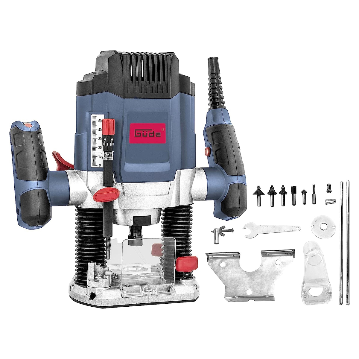 Auf Lager Versand durch AmazonGüde 58117 Oberfräse OF 1200 E (1200 W, Hubhöhe: 55 mm, 7-fach einstellbarer Tiefenanschlag, Spannzangenaufnahme: 6 + 8 mm, 2-Säulen Führung, stufenlose Drehzahlregulierung, inkl. 6 Fräsaufsätze uvm.)