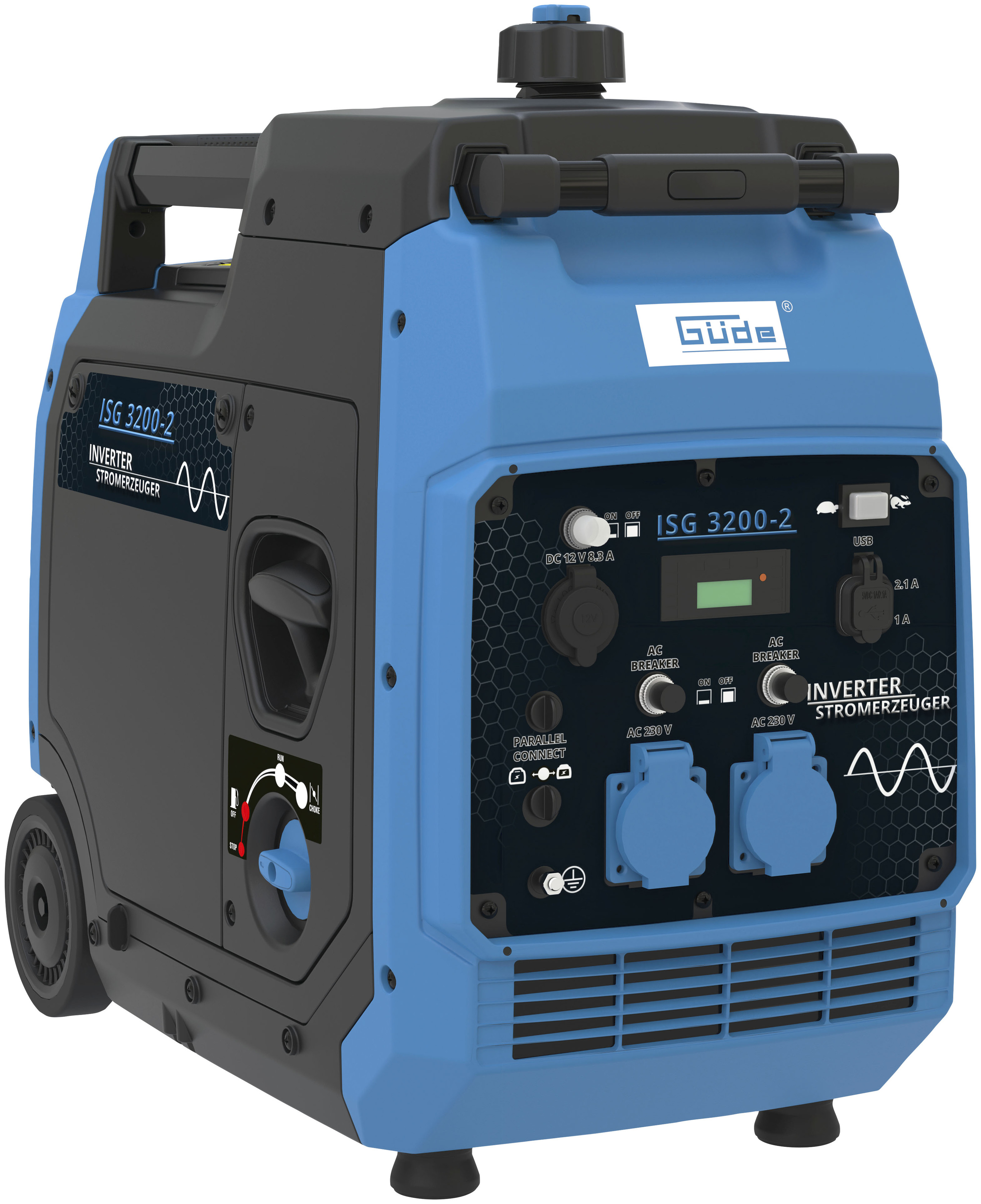 Gewöhnlich versandfertig in 4 bis 5 TagenGüde Inverter Stromerzeuger ISG 3200-2 (4-Takt Motor, Benzin, 4,5/6,1 (kW/PS), 2x 230 V, 1x 12 V, 2x USB, max. 3500 W, Laufzeit bis 7,5 h, Tank 7,8 l, ECO-Funktion, Re-Start-Knopf, Fahrwerk, TüV/GS)