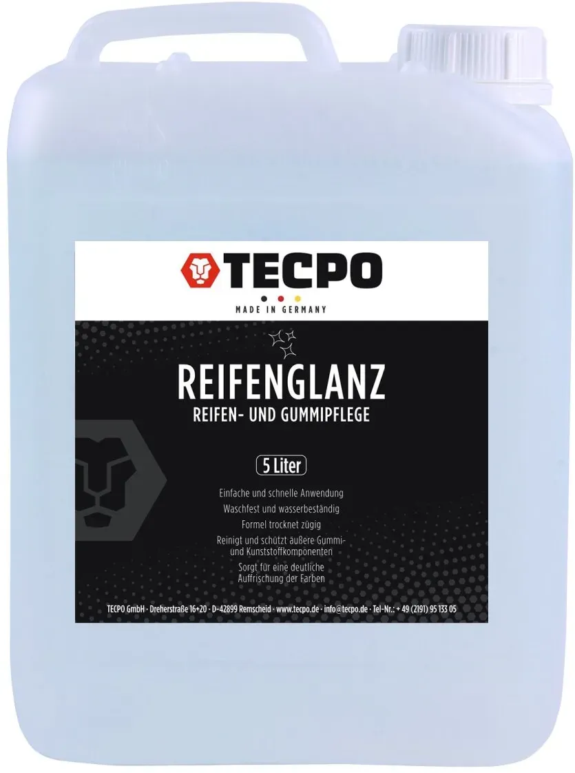 Zustand: Neu - 15,55 € / l - Reifenglanzmittel - ALCLEAR - 721RK - EAN: 4260187183705 - REIFENGLANZ & PFLEGE: Frischt die Farbe von Reifenflanken, Dichtungen und Kunststoffleisten auf - mit seidenmattem Finish. Verteilt sich gleichmäßig, trocknet ohne Rückstände. Wirkt farbauffrischend und unterstützt strukturierte Fahrzeugpflege. KONTROLLIERTE ANWENDUNG: Inklusive Auftragsschwamm für sauberes, gezieltes Verteilen. Kein Tropfen oder Spritzen - für Reifen, Gummileisten, Türgummis, unlackierte Kunststoffe. Sparsam dosierbar, mehrfach einsetzbar. LANGZEITPFLEGE MIT UV-SCHUTZ: Schützt Gummi- und Kunststoffteile vor Ausbleichen und Versprödung. Reduziert UV-Einflüsse - geeignet für Auto, Motorrad, Caravan oder Wohnmobil. Auch bei häufiger Anwendung wirkungsvoll. RÜCKSTANDSLOS & FARBECHT: Die milchige Textur zieht schnell ein, hinterlässt keinen fettigen Film und färbt nicht ab. Auch für schwarze Reifen, matte Kunststoffe oder Türgummis geeignet - benutzerfreundlich im Einsatz. 1000 ML REIFENPFLEGE: In kindersicherer Flasche - recycelbar und robust. Sparsam im Verbrauch, entwickelt für professionelle Fahrzeugaufbereitung. Kombination aus Pflege und Schutz - geeignet für regelmäßige Anwendung. - bei Amazon.de Ein großvolumiges Produkt von TECPO, das eine kostengünstige Lösung für die Reifen- und Gummipflege in größeren Mengen bietet. ![]() ![]() TECPO Reifenglanz und Gummipflege Reifen Pflege 5L (5,80 pro 1 l)