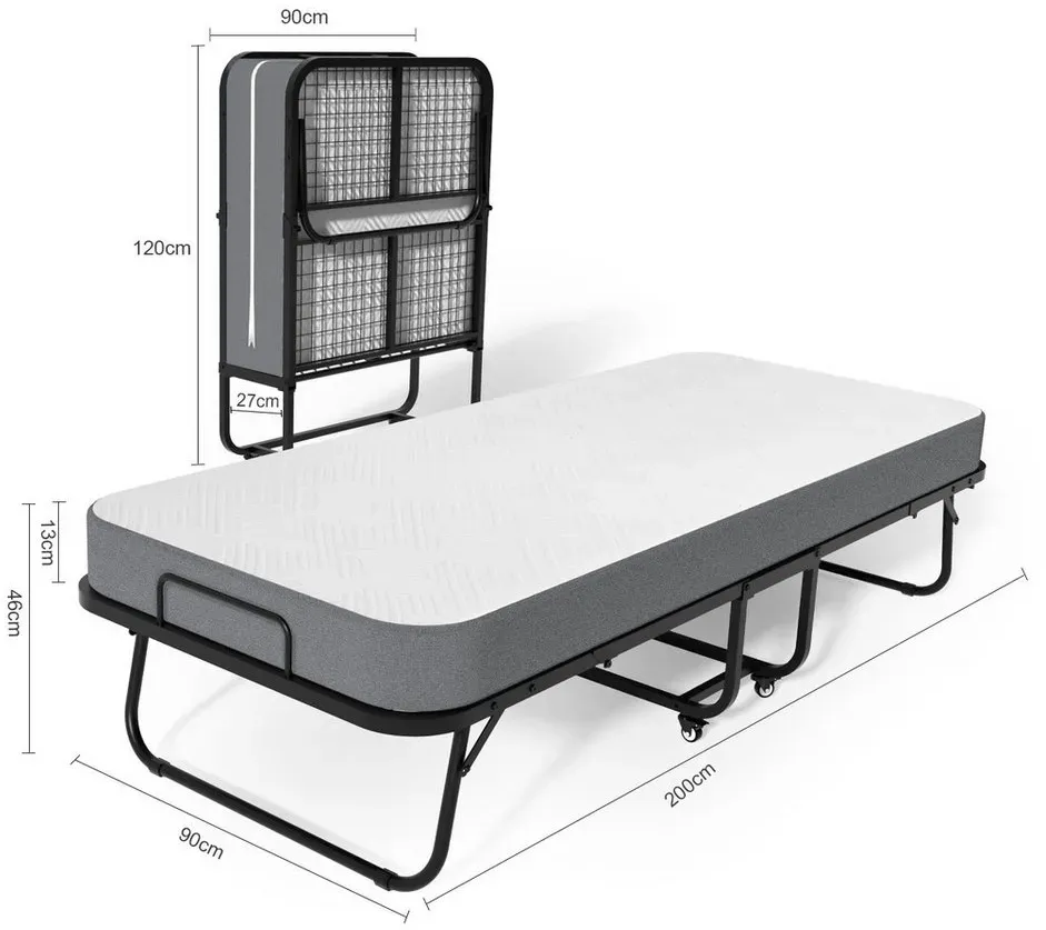 EAN: 4262491820291 - Stabiles Metallgestell inkl. Matratze. Einer Tragfähigkeit von 250 kg.Ausgestattet mit vier Rädern für einfachen Transport und Falten.Geeignet für Gästebett, Faltbett, Campingbett, Feldbett.Nur wenige Handgriffe und schon verwandelt sich es in eine gemütliche Schlafbett.BeschreibungenKlappbett für Erwachsene, Bettgestelle 90 x 200 cm, verdickte Halterungen mit einem Durchmesser von 2,5 cm und feinem Metallgeflecht (3,8 cm Abstand), mit einer Tragfähigkeit von 250 kg,Die Matratze ist 13 cm dick (Memory-Schaum 10 cm, Latexschaum 3 cm). Weiche Bettdecke aus reiner Baumwolle, weich und bequem, abnehmbares Reißverschlussdesign, waschbar.Ausgestattet mit vier Rädern: Das klappbare Metallbett ist mit vier um 360 drehbaren Rädern ausgestattet, die problemlos von einer Person bewegt werden können.Vielseitigkeit: Das platzsparende Klappbett kann als Ersatzbett, als Gästebett im Wohnzimmer, Arbeitszimmer oder als Camping- oder Urlaubsreisebett genutzt werden.Einfache Montage: Das Klappbett ist werkseitig vormontiert und die Module sind bereits montiert. Durch einfache Montage lässt es sich schnell zusammenbauen.Technische Daten:Material: Metall, Memory-Matratze Schaumstoff,Liegefläche: 90x200 cmGesamtabmessung: 200x 90 x 46 cm (L x B x H)Faltmaß: 90x 27 x 120 cm (L x B x H)Matratzendicke: 13cmNettogewicht: 22.3 kgGewichtskapazität: 250 kgLieferungsumfang:1 x Klappbarer Gästebett mit 4 Rädern.1 x Matratze1 x AnleitungBeschreibung der anwendbaren Szenarien Einer ... ![]() kaufland.d e GUNUSS Klappbett Erwachsene Gästebett Klappbar mit13 cm Dicke Matratze 200x90x46cm Reisebett Metallbett einer Tragfähigkeit von 250 kg