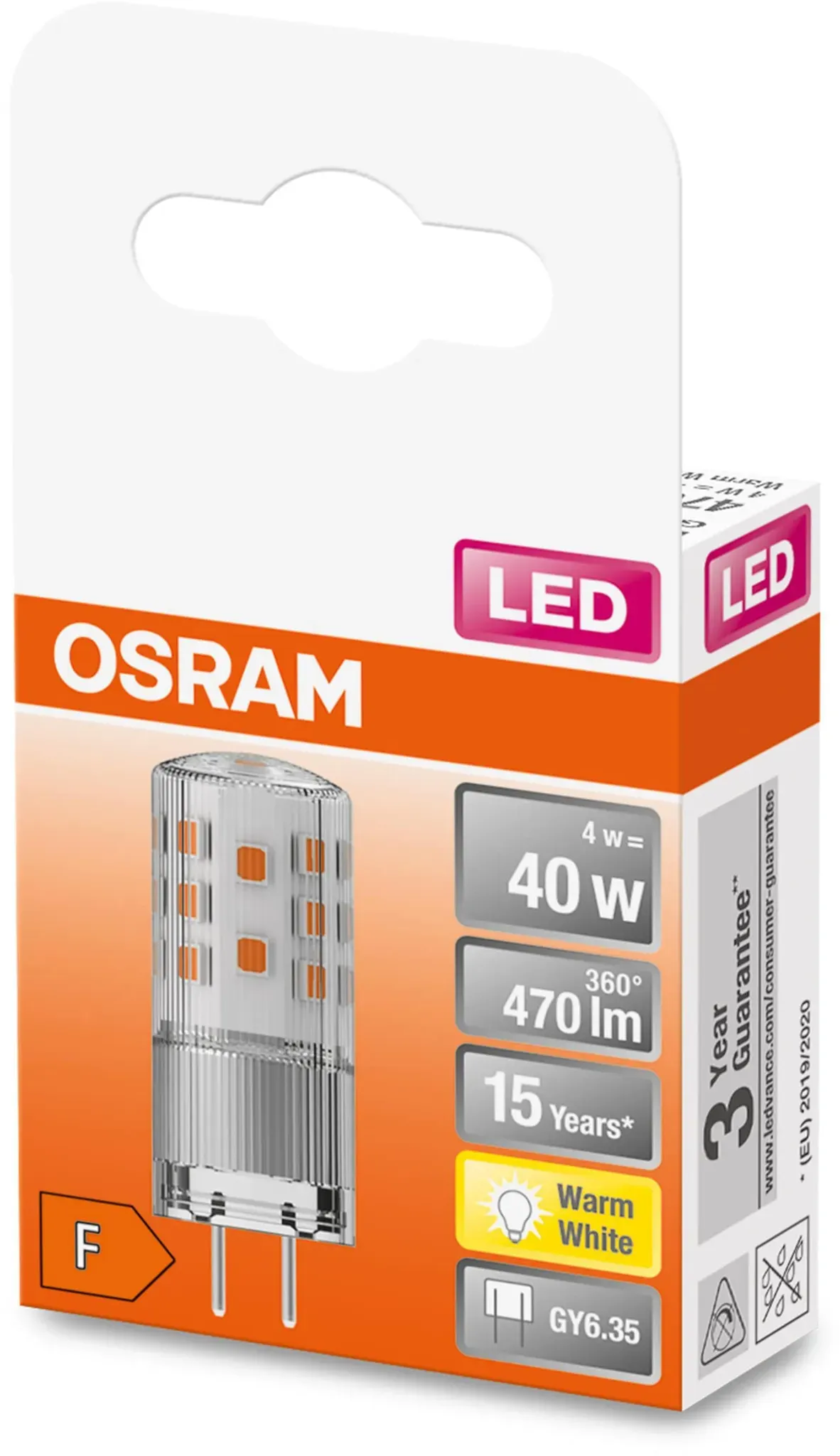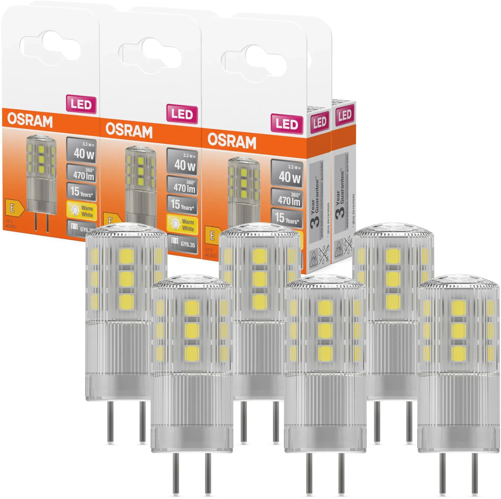 LED-Lampen Lampen & Leuchten Leuchtmittel LED-Leuchtmittel LED-Leuchtmittel GY6.35 Glühbirnen - EAN:4058075607224 - 12 V-Niedervolt-LED-Lampen mit Retrofit-Stecksockel. Produkteigenschaften: Kompatibel mit vielen handelsüblichen elektronischen Vorschaltgeräten . LED-Alternative zu Niedervolthalogenlampen. Sockel: G4, GY6.35. Produktvorteile: Variabler Einsatz an Gleich- und Wechselspannung möglich. Gute Rundum-Lichtausstrahlung. Ideal für den dekorativen und frei brennenden Einsatz. Lange Lebensdauer von bis zu 15.000 h. Drei Jahre . Anwendungsgebiete: Dekorative Anwendungen. Für stimmungsvolle Lichtakzente in Wohnräumen und Partykellern. Einsatz im Außenbereich nur in geeigneten Außenleuchten. Höhe 1.8 cm Materialmix Kunststoff Breite 1.8 cm Länge 5 cm Gewicht 10 g Durchmesser 1,8 cm Farbe mehrfarbig Verpackungsgröße 1 - gefunden von Kelkoo Dieses 6er-Pack bietet ein hervorragendes Preis-Leistungs-Verhältnis für den Kauf mehrerer Lampen. ![]() ![]() OSRAM LED Star PIN 40, LED-Pinlampe für GY6.35 Sockel, Warmweiß (2700K), 470 Lumen, Ersatz für herkömmliche 40W-Glühbirnen, 6er-Pack