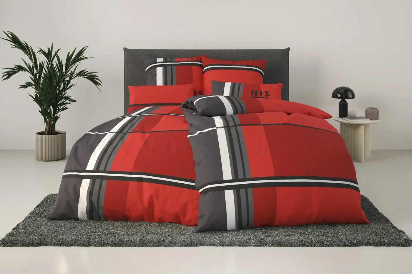 Bettwäsche-Sets Wohnen Schlafzimmer Bettwaren - - Die karierte Bettwäsche »CASSIA« von H.I.S ist ein Blickfang in deinem Schlafzimmer. Sie überzeugt durch ein trendiges Design und ist in attraktiven Farben gestaltet. Mit ihrem modernen und sportlichen Muster setzt die Bettgarnitur dekorative Akzente in deiner Einrichtung. Zur Reinigung kannst du sie bei 60 °C in der Maschine waschen. Lädt zu traumhaften Nächten ein: die gemusterte Bettwäsche »CASSIA« von H.I.S., Allgemein: Anzahl Teile: 2 tlg., Anzahl Bettbezüge: 1 St., Anzahl Kissenbezüge: 1 St., Optik/Stil: Farbe: rot, Optik Kissenbezug: kariert, Optik Bettbezug: kariert, Verschluss: Verschluss Kissenbezug: Knöpfe, Verschluss Kissenbezug Details: verdeckte Knopfleiste, Verschluss Bettbezug: Knöpfe, Verschluss Bettbezug Details: verdeckte Knopfleiste, Material: Materialart: Linon, Materialzusammensetzung: Obermaterial: 100% Baumwolle, Flächengewicht: 91 g/m2, Pflegehinweis: Pflegehinweise: nicht bleichen, Trocknen mit reduzierter thermischer Belastung (60u00b0C), mäßig heiß bügeln (150u00b0C), Keine chemische Reinigung, 60u00b0C Maschinenwäsche, Wissenswertes: Farbhinweise: Bitte beachten Sie, dass die Farben auf Ihrem Monitor von den Originalfarbtönen abweichen können., OEKO-TEX Standard 100 Zertifikatsnummer: Sammelzertifikat 09.0.67812, Maßangaben: Breite Bettbezug: 135 cm, Länge Bettbezug: 200 cm, Breite Kissenbezug: 40 cm, Länge Kissenbezug: 80 cm - Decken Breite: 135cm - Versandkostenfrei: false - Sale: true - ... ![]() ![]() H.I.S Bettwäsche 'Cassia', in sportlichem Karo Design,Bettwäsche aus Baumwolle,ab Gr. 135x200 cm