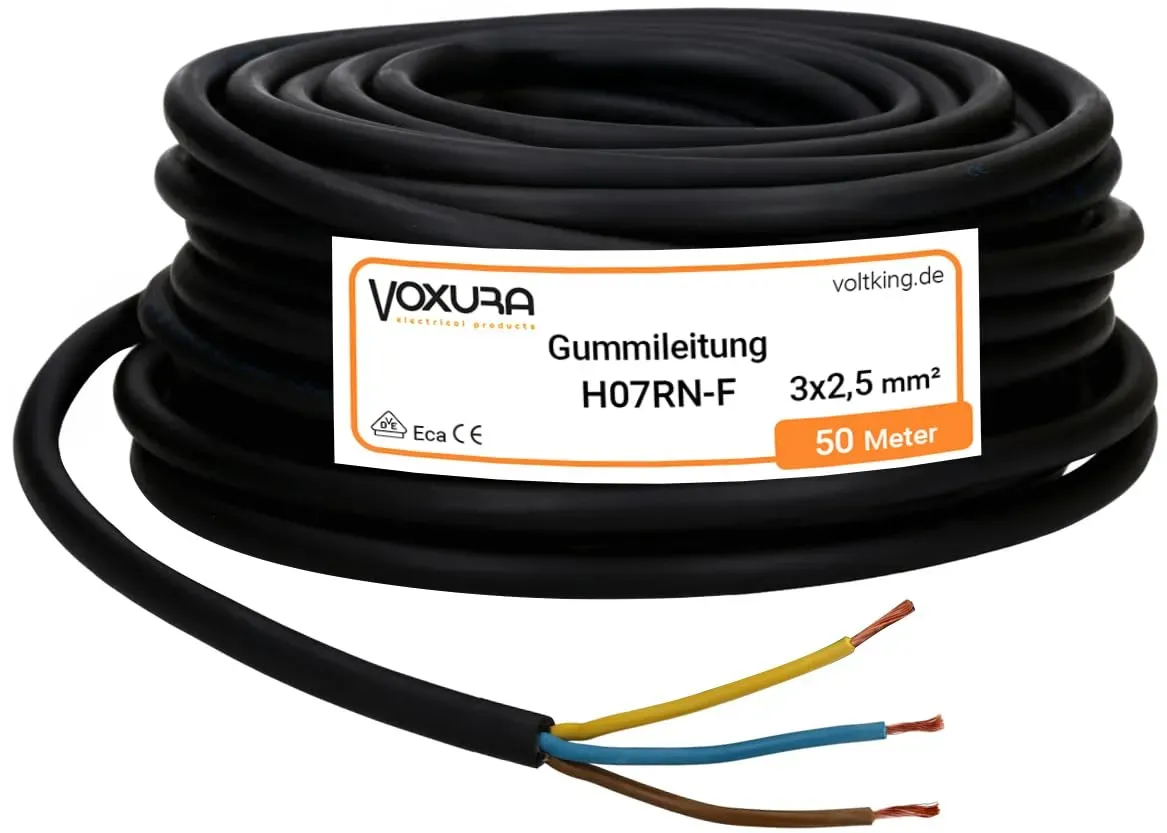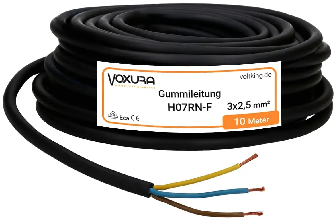 Zustand: Neu - 3,53 € / Meter - Elektrische Leitungen - Kalitec - 10111702-5-001 - EAN: 4255769402343 - Die schwere Gummischlauchleitung H07RN-F, hergestellt nach dem harmonisierten europäischen Baumuster H07RN-F. Breite Einsatzmöglichkeiten: HAR-Leitungen sind in Europa weit verbreitet und für eine Vielzahl von Anwendungen geeignet. Vielseitige Verwendung: Unsere Elektroleitung ist für die kurzschluss- und erdschlusssichere Verlegung geeignet und ideal für den Einsatz mit Hand- oder Netzgeräten, sowie für schwere gewerbliche Geräte wie Werkzeuge, landwirtschaftliche Geräte und auf Baustellen. Anpassungsfähig und robust: Das Stromkabel kann fest oder frei verlegt werden, auch in Schutzschläuchen, und ist für den Einsatz in trockenen, nassen, rauen sowie öligen Umgebungen optimiert. Hoch belastbar und flexibel: Das Anschlusskabel ist UV-beständig und ölbeständig, hält schweren mechanischen Belastungen stand und ist für den Außenbereich geeignet. Zudem ist es flexibel einsetzbar bei Temperaturen bis zu -25 °C. - Verkäufer: Kalitec Verbindungstechnik im amazon.de Marketplace Ein solides Angebot für eine 10 Meter lange Gummileitung, die flexibel und widerstandsfähig ist. ![]() ![]() Voxura H07RN-F 3x2,5 mm2 10 Meter Gummileitung flexibel mit Schutzleiter 3G2,5 UV-resistent ölbeständig für Außenbereich Campingkabel Baustellenkabel