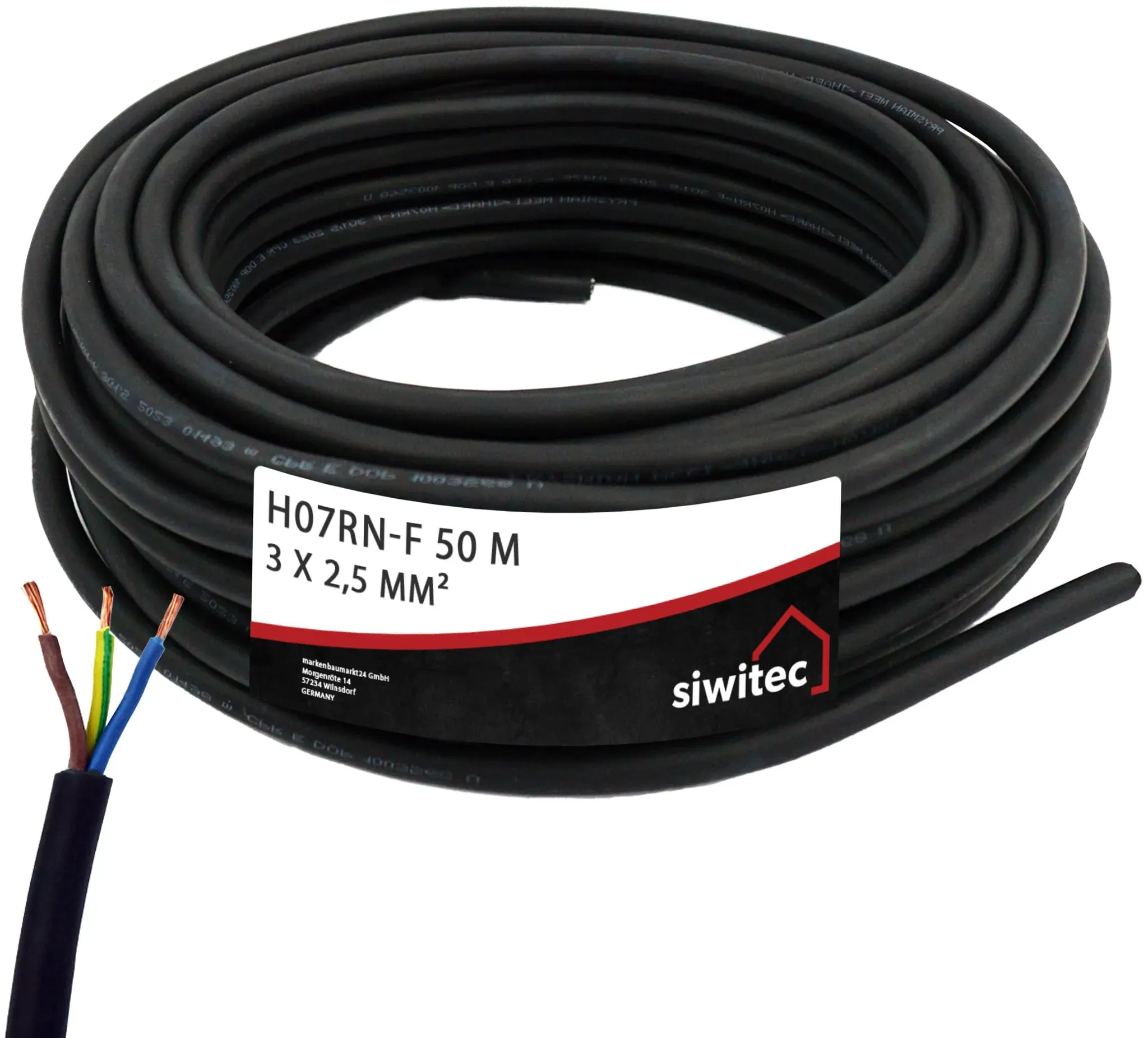 Kategorie: Kabel & Leitungen - netbote24 - GTIN:4260305932406 - Schwere Gummileitung H07RN-F 3G2,5 Kabelmantel aus ölbeständigem Neopren-Kautschuk. Länge von 5-50m wählbar. Zur Verlegung in oder unter Putz, in feuchten Räumen und im Freien. Nicht geeignet für die ungeschützte Verlegung im Erdboden. Temperaturbereich von -25 C bis 60 C / 16 Ampere bei AC 400V Durch feindrahtige Kupferlitzen erhält das Kabel eine hohe Flexibilität International: EN 50525-2-21; HD 22,4; HD 516; IEC 60245-4 type 55; National NF C 32-102-18 - 54,40 Euro bei Amazon Marketplace Home Improvement - gefunden von billiger.de Dieses 25 Meter lange siwitec Kabel ist "Made in Germany" und steht für Qualität und Langlebigkeit. ![]() ![]() siwitec Gummischlauchleitung H07RN-F 3G2,5, 3x2,5 mm2, 25 m, Schwarz, 450/750 V, Stromkabel, Elektrokabel, Gummikabel - Made in Germany