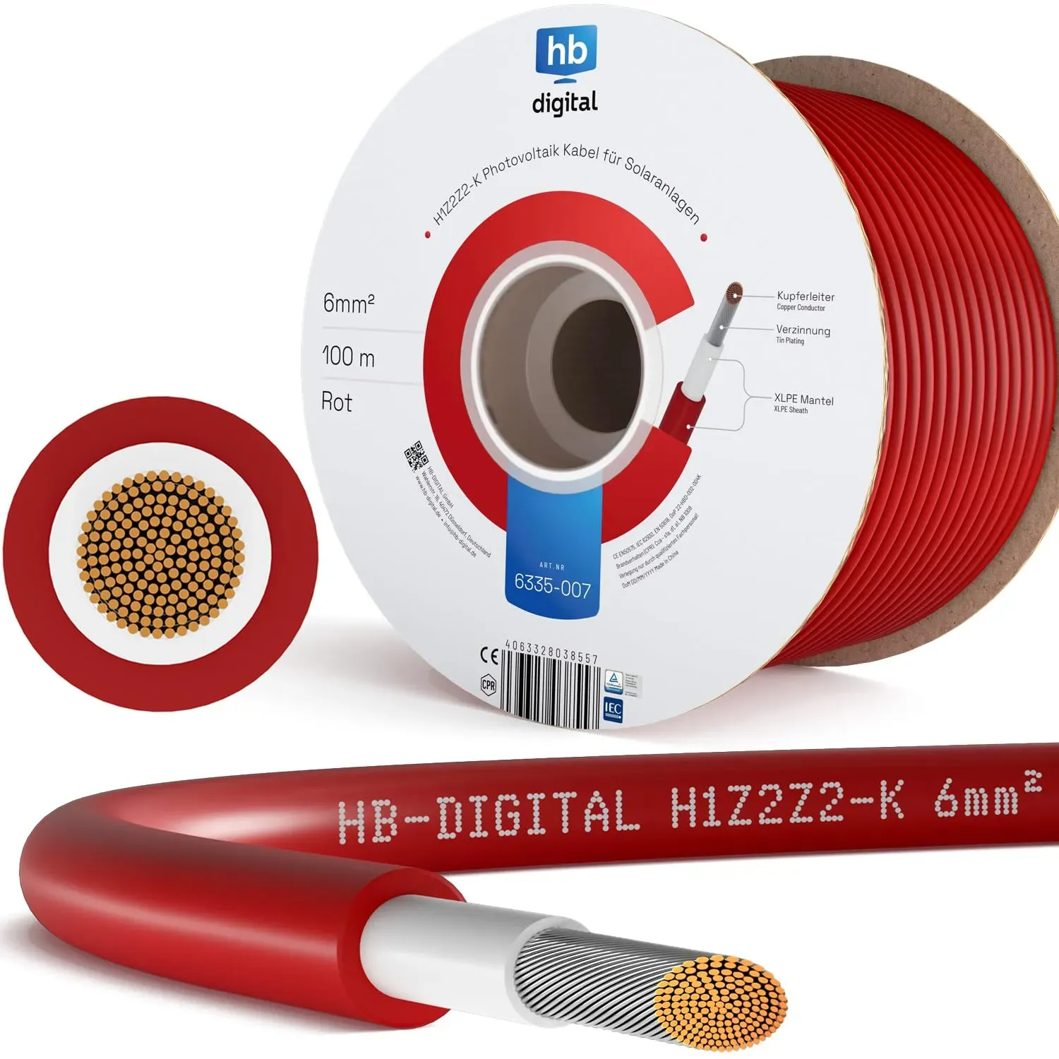 Kategorie: Kabel & Leitungen - HB-Digital - GTIN:4063328062361 - Wichtiger Hinweis: Mit dem Kauf bestätigen Sie, dass Sie als Privatperson eine Photovoltaikanlage mit einer Leistung von bis zu 30 kWp betreiben, die auf oder in der Nähe von privaten, gemeinnützigen oder öffentlichen Gebäuden in Deutschland installiert ist. Eine gewerbliche Weiterveräußerung ist ausgeschlossen. Die Voraussetzungen für den Nullsteuersatz gemäß 12 Abs. 3 UStG sind erfüllt. Robustes Solarkabel für den Außeneinsatz: Das PV-Kabel ist speziell für den Einsatz im Freien konzipiert und verfügt über eine zweischichtige XLPE-Isolierung, die es vor Umwelteinflüssen wie Regen, Schnee, UV-Strahlung und extremen Temperaturen schützt. Hohe Spannungsfestigkeit und Sicherheit: Mit einer Nennspannung von DC 1500V und einer maximal zulässigen Betriebsspannung von DC 1800V gewährleistet das Solarmodulkabel einen zuverlässigen Betrieb in Solaranlagen. Es erfüllt strenge Normen für elektrische Sicherheit. Witterungs- und UV-beständig nach Norm: Das Solarkabel ist gemäß EN 50289-4-17 UV-beständig und nach EN 60811-2-1 säure- und laugenbeständig. Es widersteht extremen Temperaturen von -40 C bis +90 C, wodurch es für langfristige Nutzung geeignet ist. Sicherer Betrieb mit minimalen Verlusten: Die Auswahl des richtigen Kabelquerschnitts reduziert Spannungsverluste und erhöht die Effizienz der Solaranlage. Die hohe elektrische Leitfähigkeit des verzinnten Kupfers sorgt für eine stabile Energieübertragung. - 86,90 ... Ein 6mm² Solarkabel von HB-DIGITAL, das von der Mehrwertsteuer befreit ist und TÜV-zertifiziert ist. ![]() ![]() HB-DIGITAL 100m Solarkabel H1Z2Z2-K inkl. 0% MwSt. gem. 12 Abs. 3 UStG - TüV Rheinland zertifiziertes - 6mm2 flexibel UV PV Kabel reines Kupfer 1500V DC für Solarpanel- Rot