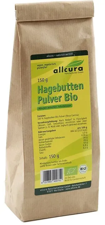 18 Händlerangebote bei billiger.de - Kategorie: Arzneimittel - Allcura - HAGEBUTTEN PULVER Bio 150 g - GTIN:4017893400752 - PZN:18400929 Dieses 400g Bio Hagebuttenpulver von GreatVita bietet ein hervorragendes Preis-Leistungs-Verhältnis für eine gröÃ?ere Menge. ![]() ![]() Bio Hagebuttenpulver 400g | ganze Hagebutte gemahlen | 100% naturreines Hagebutten Pulver aus kontrolliert biologischem Anbau | GreatVita