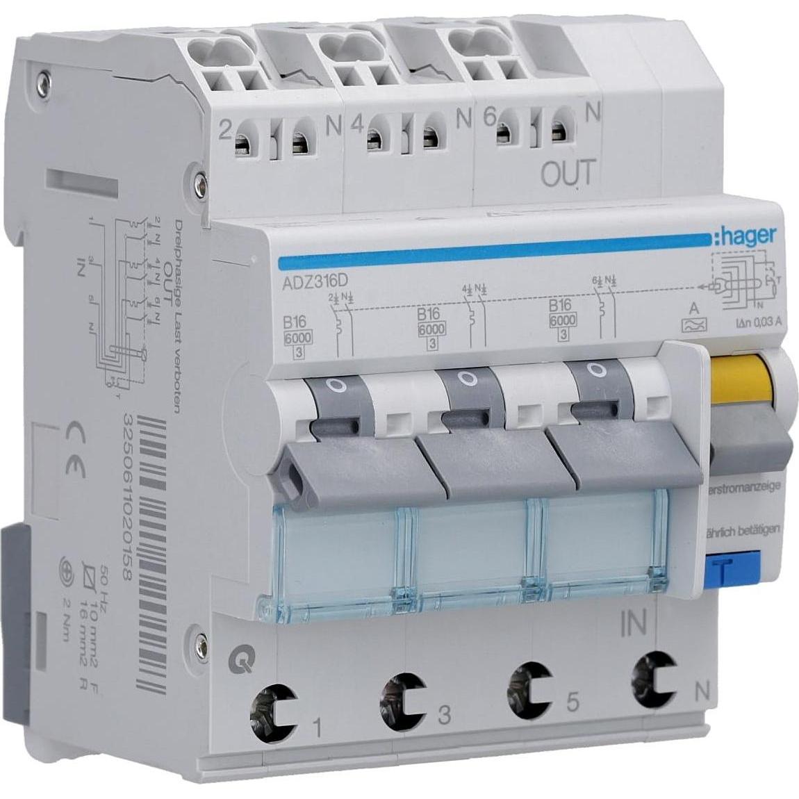 Hager - EAN: 3250611020158 - Fehlerstromschutzschalter gemäss DIN VDE 0664-20 / EN61009-1 mit 3 x 1-poligen Miniatur-Leistungsschaltern für 230 V AC-Stromkreise und einem Fehlerstromschutzschalter in einem kompakten Gehäuse. QuickConnect-Anschluss gemäss DIN EN 60898-1, VDE 0641-11, am Zuleitung bis 16 A und an der Zuleitung bis 63 A, Berührungsschutz gemäss IP2x DIN VDE 0106 Teil 100, blauer Testknopf und Fehlerstromanzeige. Einfache individuelle Abnahme vom Phasensammelschienensystem. Mit VDE-Symbol. Geeignet für die Nachrüstung zusätzlicher Geräte. Beschriftungsmöglichkeit direkt am Gerät. - bei galaxus.de - aus Yadore Produktdaten Ein beliebtes Angebot, das einen Hager ADZ316D Fehlerstromschutzschalter RCBO 16A zu einem fairen Preis anbietet. ![]() ![]() Hager ADZ316D - Fehlerstromschutzschalter RCBO eBay 16A