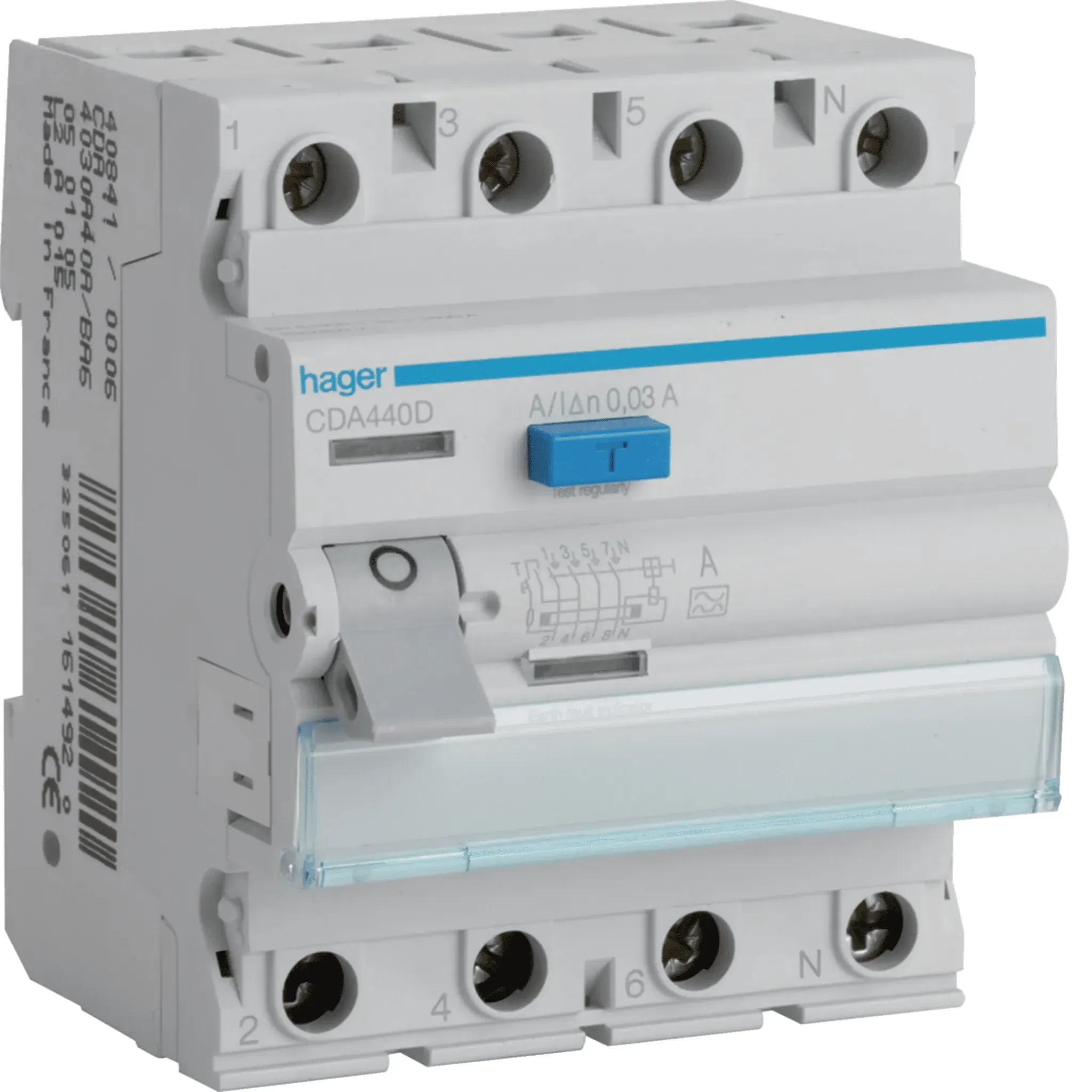 Sofort verfügbar (Lieferzeit 1-3 Werktage)Hager CDA 440 D, FI-Schutzschalter 40A, 30mA, Typ A, 4polig