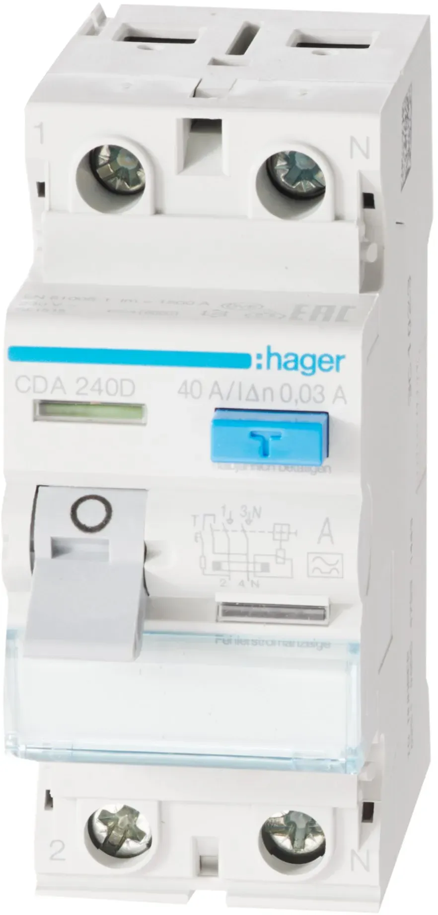 19 Händlerangebote bei billiger.de - Kategorie: Sonstige Elektroinstallationsartikel - Hager - Fehlerstromschutzschalter 2 polig 6kA 25A 30mA Typ A.Fehlerstrom-Schutzschalter (FI) nach DIN EN 61008-1 (VDE 0664-10), DIN EN 61008-2-1 (VDE 0664-11) mit Bi-Connect-Klemmen unten, externe blaue Test-Taste und Fehlerstromanzeige. Geeignet zum nachträglichen Anbau von Zusatzeinrichtungen. Anschlussklemmen mit Draht-Einschiebe-Schutz, Beschriftungsmöglichkeit direkt am Gerät. - GTIN:3250611610038 Dieser 2-polige FI-Schutzschalter mit 40A und 30mA ist ein preisgünstiger Einstieg für Standardanwendungen. ![]() ![]() Hager FI-Schutzschalter CDA240D