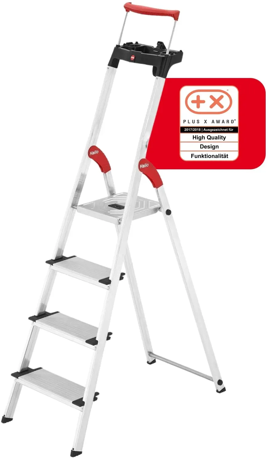 Zustand: Neu - Stehleitern - Hailo - 8040-507 8040507 - EAN: 4007126023940 EAN: 4007126244062 - STABILE ALUMINIUMHOLME - Aluminiumleiter mit verzinkter Stahl-Plattform mit Anti-Rutsch-Riffelung, Norm EN 131 belastbar bis 150 kg, mit patentiertem Gelenkschutz GROßE STUFEN FÜR MEHR SICHERHEIT - 5 extra tiefe Alustufen 13cm mit rutschfester Riffelung und Anti-Rutsch Steckfüßen für sicheren Stand, Hailo EasyClix Wechselfüße separat erhältlich ABLAGESCHALE UND EIMERSCHLAUFE - zur Ablage von Werkzeugen, Malerzubehör und Kleinteilen, die Eimerschlaufe hat einen Klick-Schnellverschluss zur sicheren Befestigung von Eimern und Kabeltrommeln HAILO QUALITÄT: Unser Markenzeichen ist der rote HAILO-Punkt. Dahinter steht ein verantwortungsvolles Familienunternehmen, hohe Produktqualität mit einfacher Handhabung sowie exzellenter Service HERGESTELLT IN DEUTSCHLAND - schnell auf- und eingeklappt, Gesamthöhe 168 cm, Arbeitshöhe bis 3,07 m, Aufstellbreite 48 cm, Aufstelltiefe 101 cm, Gewicht 5,3 kg, komplett vormontiert geliefert - bei Amazon.de ![]() ![]() Hailo L85 ComfortLine Alu-Sicherheits-Stehleiter - 4 XXL-Stufen belastbar bis 150 kg - Tiefe Standfläche & Haltegriff - Stehleiter mit Ablage - Aluleiter Made in Germany - Leiter rostfrei - Silber