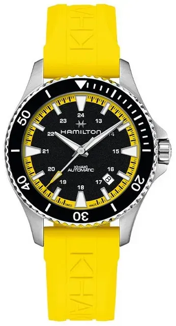 4 Händlerangebote bei billiger.de - Kategorie: Herrenuhren - Hamilton - Swiss Made Automatikuhr in Unisexgröße aus der Kollektion Khaki Navy, mechanisches Automatikwerk H-10 mit NivachronTM Spirale, Gangreserve bis zu 80 Stunden, Datumsanzeige, schwarzes Zifferblatt mit gelber Umrandung, lumineszierende Zeiger und Indizes, weiße Zahlen, zentraler Sekundenzeiger, Gehäuse aus mattiertem 316L-Edelstahl, einseitig drehbare schwarze Lünette mit Minutenskala, verschraubter Gehäuseboden, verschraubte Krone, kratzfestes, entspiegeltes Saphirglas, Armband aus gelbem Kautschuk, matte Dornschließe mit Logo, wasserdicht bis zu einem Druck von 10 bar, Breite (ohne Krone) 40 mm, Höhe 12,95 mm - GTIN:7630458805174 Die Jazzmaster Performer Auto ist eine elegante Uhr, die sowohl sportlich als auch klassisch getragen werden kann. ![]() ![]() Hamilton Jazzmaster Performer Auto H36205110 Herren Automatikuhr