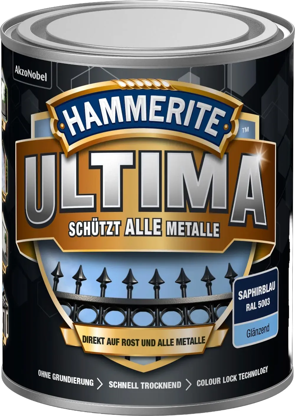 3 Händlerangebote bei billiger.de - Kategorie: Farben & Lacke - HAMMERITE - Der Hammerite Metallschutz-Lack Ultima Glänzend 750 ml Silber RAL9006 schützt alle Metalle und kann direkt auf Rost aufgetragen werden. Der ultimative Schutzlack ist Grundierung und Lack in einem und extrem farbton- und glanzstabil. Hammerite Ultima schützt Gartenzaune, Treppen- und Balkongeländer, Garagentore, Fahrräder sowie viele weitere Metalle im Außenbereich. Erhältlich ist der Lack in 6 RAL-Farbtönen in Matt und Glänzend. Verbrauch: 135 ml / m2 pro Anstrich. 250 ml sind ausreichend für ca. 0,9 m2, 750 ml für 2,8 m2 bei 2 Anstrichen, Trockenzeit: nach ca. 1 - 2 Std. staubtrocken, nach ca. 4 Std. überstreichbar je nach Temperatur und Luftfeuchtigkeit. Die Endhärte und der Glanzgrad des Lackes werden nach maximal 2 Wochen erreicht. - GTIN:4007591725479 Ein saphirblauer glänzender Ultima Metallschutzlack, der eine kräftige Farbe und hohen Schutz bietet. ![]() ![]() Hammerite Ultima Glänzend, Metallschutzlack, Hochwertiger Schutzlack für alle Metalle im Außenbereich, Saphirblau RAL5003, 750 ml