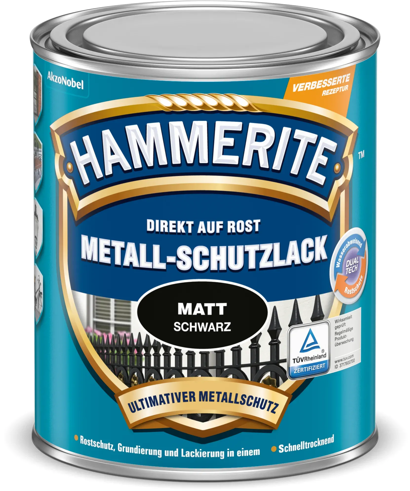 20,44 /l - Kategorie: Farben & Lacke - Akzo Nobel - GTIN:4007591576095 - Wie alle Hammerite Metall-Schutzlacke ist auch der Hammerite Metall-Schutzlack Hammerschlag Rostschutz, Grundierung und Lack in einem. Er ist für alle blanken, angerosteten oder mit Altanstrichen versehenen Eisenmetalle und Nichteisenmetalle (nach vorheriger Behandlung) geeignet. Metall-Schutzlack Hammerschlag, Direkt auf Rost, Schnell trocknend, Hohe Schlag- und Kratzfestigkeit, Zuverlässiger Schutz vor Rostbefall, Hochgradig witterungs- und UV-beständig.Verbrauch: 1L ist ausreichend für ca. 5m2 bei 2 Anstrichen.Trockenzeit: nach ca. 1-2 Std. staubtrocken, nach ca. 4 Std. überstreichbar, je nach Temperatur und Luftfeuchtigkeit. Die Endhärte und der Glanzgrad des Lackes wird nach ca. 2 Wochen erreicht. - 15,33 Euro bei Kaufland.de - gefunden von billiger.de Ein klassischer schwarzer, glänzender Metall-Schutzlack zu einem attraktiven Preis. ![]() ![]() HAMMERITE Metall-Schutzlack 750 ml schwarz glänzend