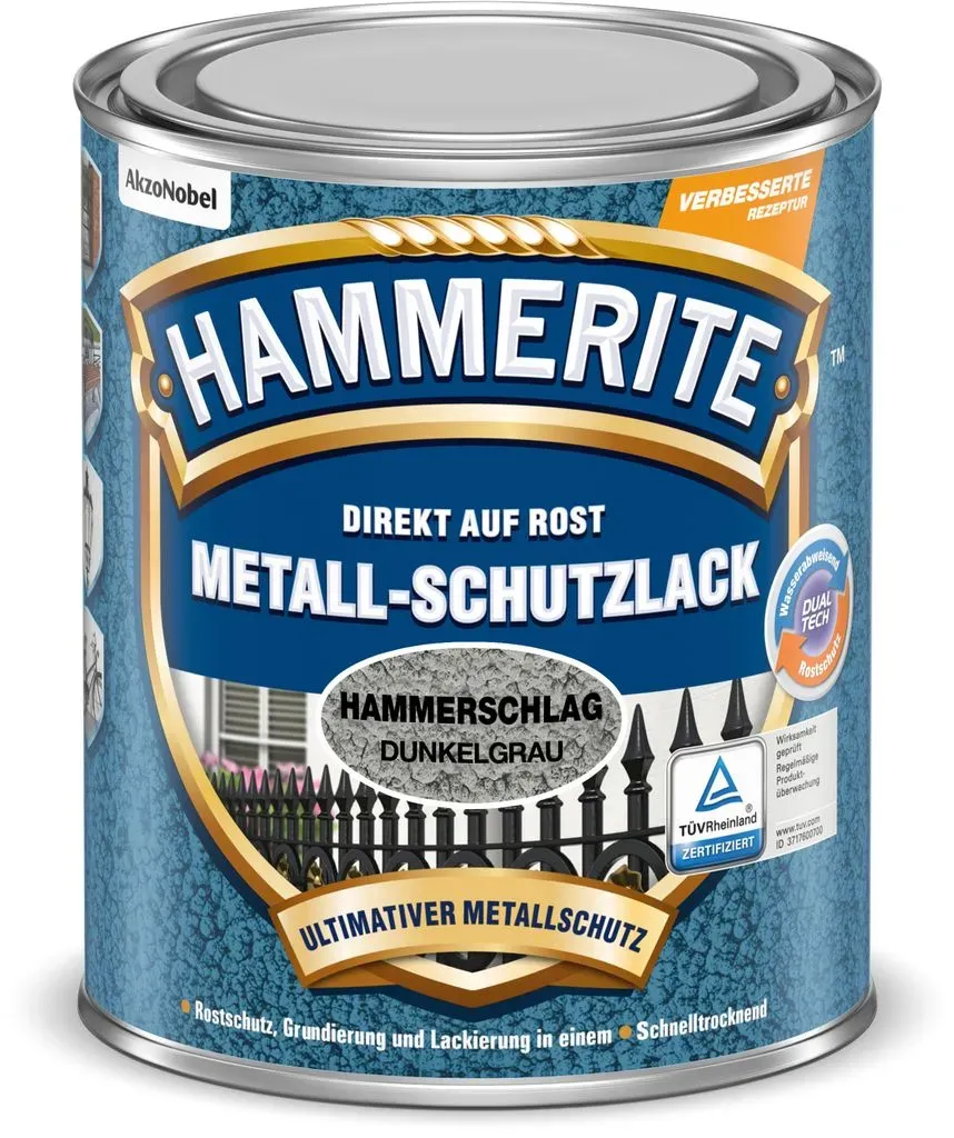 Zustand: Neu - 19,99 € / l - Lacke - Hammerite Akzo Nobel - glänzend 5087597 - EAN: 4007591565099 - Direkt auf Rost, 3in1 Hochgradig witterungs- und UV-beständig Zuverlässiger Schutz vor Rostbefall Hohe Schlag- und Kratzfestigkeit Schnell trocknend - bei Amazon.de Ein günstiger Hammerschlaglack in Dunkelgrau, der einen besonderen Effekt bietet. ![]() ![]() Akzo Nobel Hammerite Metallschutzlack Hammerschlag, 3in1 Rostschutzlack für Metall, Dunkelgrau, 750 ml - Dunkelgrau