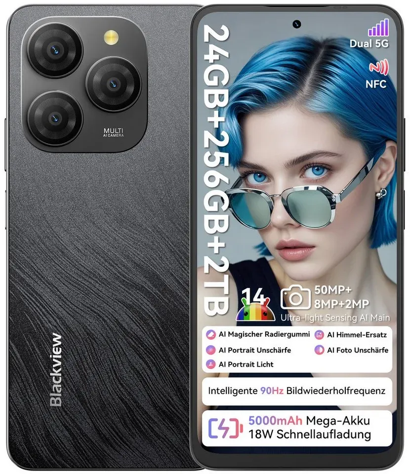 lieferbar-in 2-3 Werktagen bei dirblackview Shark9 5G AI Handy (50 MP Kamera, Dual 5G, Android 14, NFC, AI-Dialog) schwarz