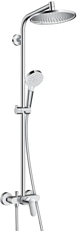 Hansgrohe - EAN: 4011097775920 - Besteht aus: Kopfbrause, Handbrause, Einhebel-Brausemischer, Brauseschlauch, Schieberum 45 verstellbarer Neigungswinkel des Schieberseinstellbare HeißwasserbegrenzungKopfbrause Crometta S 240Brausekopfgröße: 240 mmKugelgelenk: Kopfbrause im Winkel verstellbarStrahlart: RainDurchflussmenge Rain Strahl (bei 3 bar): 15 l/minBetriebsdruck: min. 1,8 bar/max. 10 barvollverchromte StrahlscheibeBrausearmlänge: 350 mmhöhenverstellbare HandbrausehalterungMontageart: AufputzinstallationAnschlussgröße DN15Anschlussgewinde G Stichmaß 150 12 mmKeramikmischsystemSteigrohr in der Höhe ablängbarBestehend ausKopfbrause 240 1jet (# 26723000)Handbrause Vario (# 26330400)Brauseschlauch 160 cm (# 28276000) - bei shkshop.com - aus Yadore Produktdaten Dieses Standardmodell ist mit 299,99 Euro ein gutes Angebot für eine grundlegende Showerpipe. ![]() Hansgrohe Crometta S 240 1jet Showerpipe