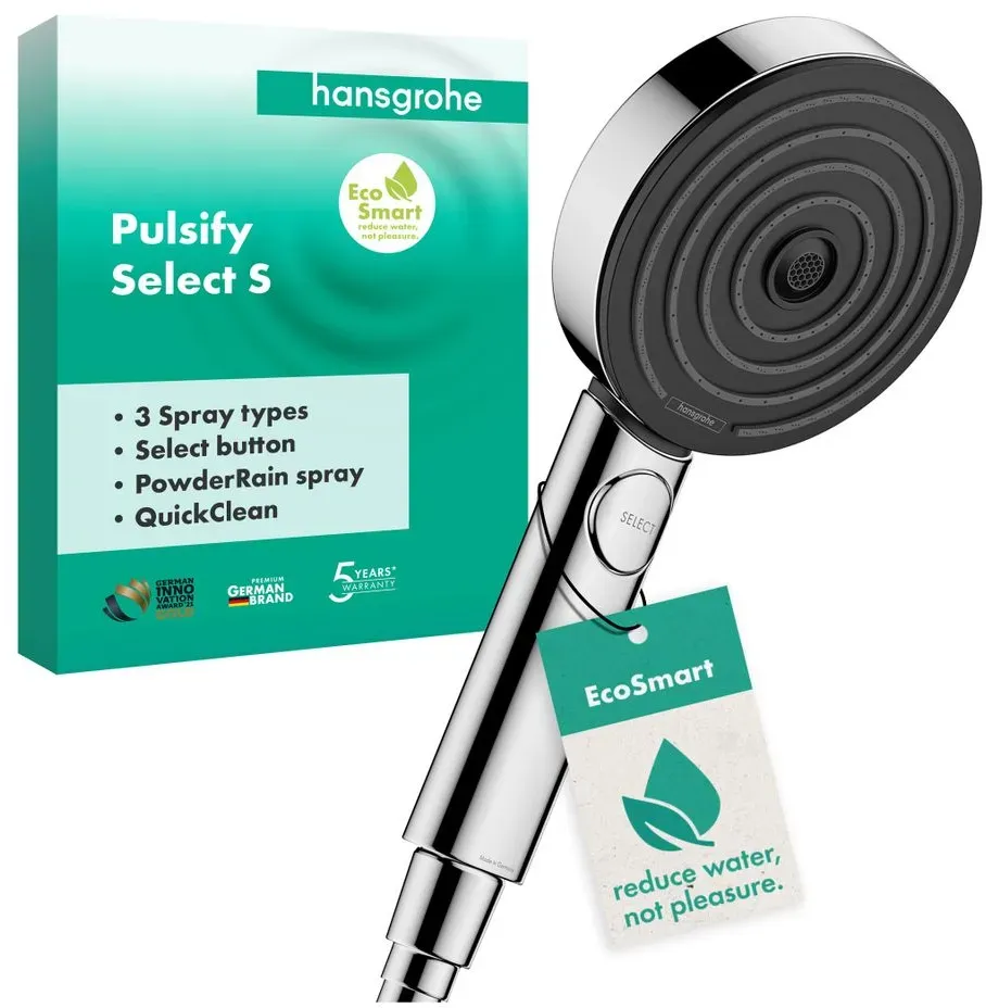 Kategorie: Handbrausen - Hansgrohe - GTIN:4059625310915 - Brausekopfgröße 105 mm, Strahlarten PowderRain, IntenseRain, Massagestrahl, Strahlartenumstellung durch Select-Taste, max. Durchflussmenge bei 3 bar 11,4 l/min, Mindestfließdruck 0,9 bar, mit innenliegender Wasserführung, ausspülbares Schmutzfangsieb, Anschlussgewinde G 1/2, Anschlussgröße DN 15, Oberfläche Strahlscheibe graphit, für Durchlauferhitzer geeignet, Quick-Clean Antikalksystem, XXL Performance - 26,42 Euro bei bau99 - gefunden von billiger.de Ein EcoSmart-Modell mit 3jet Relaxation in Chrom, ideal für Wassersparer. ![]() ![]() hansgrohe Pulsify Select S Handbrause 105mm 3jet Relaxation EcoSmart 6,9l/min, Chrom 24111000