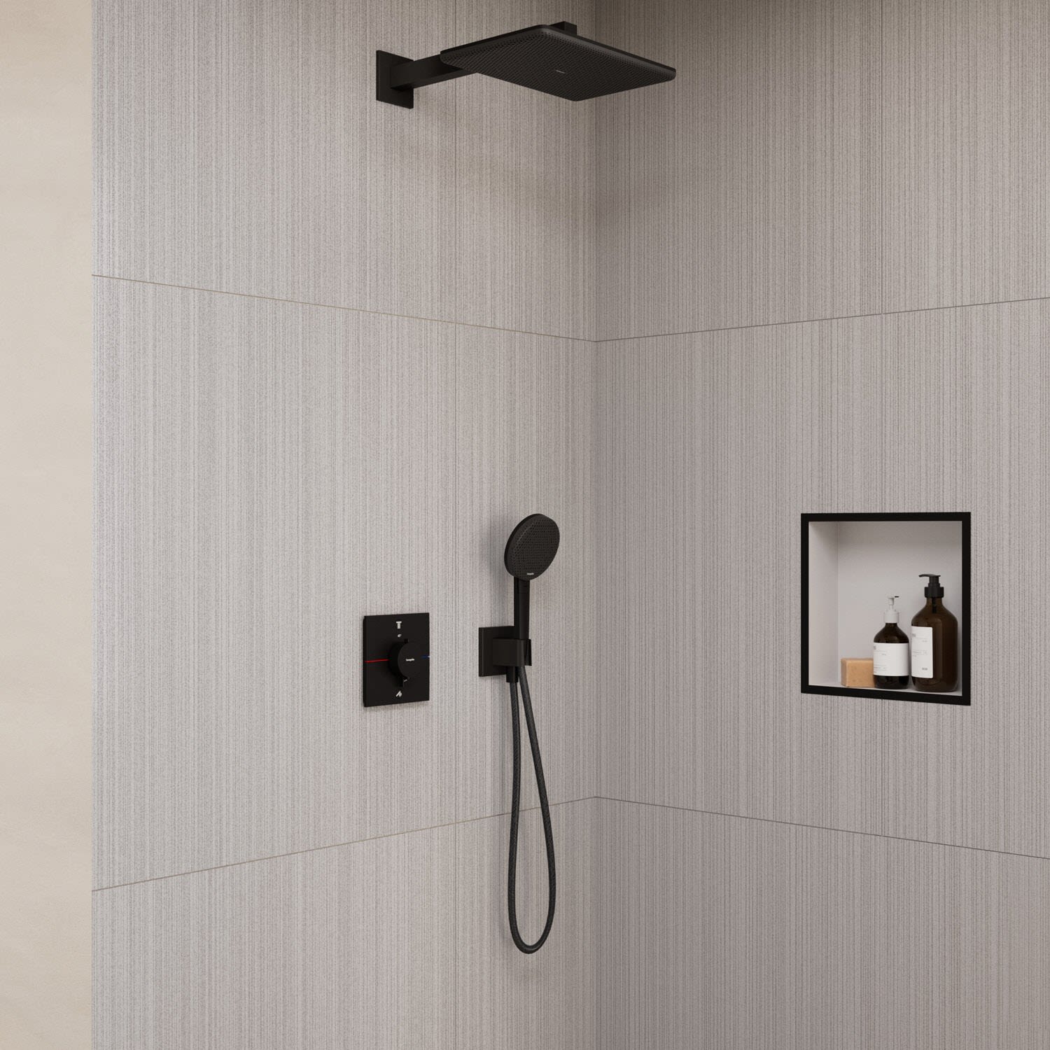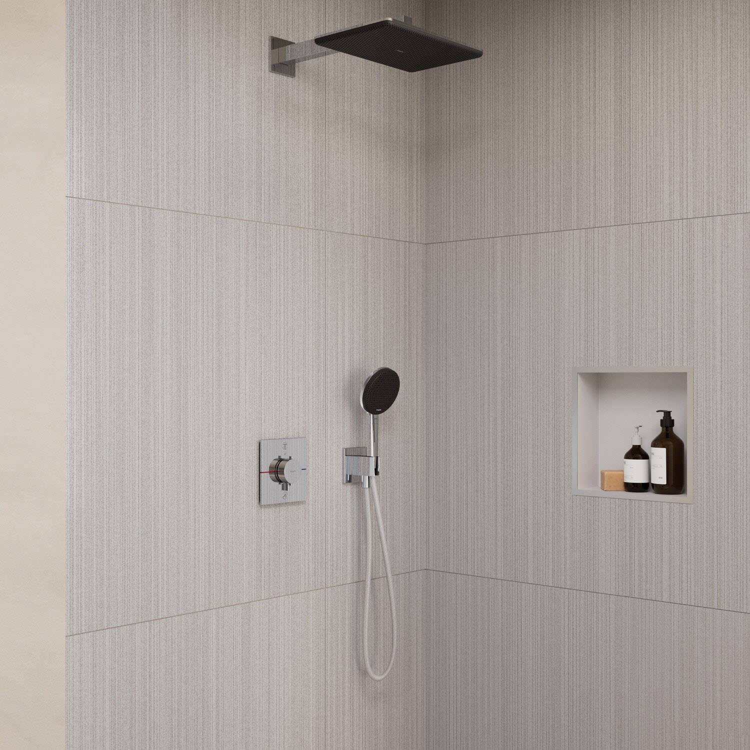 Hansgrohe - EAN: 04059625569078 - Begeisterung neu komponiert. Raindance Alive Duschset mit Thermostat, Kopf- und HandbrauseAlles aus einer Hand. Mit dem hansgrohe Raindance Alive Q Duschset 210/340 haben Sie gefunden, was Sie suchen. Ein perfekt aufeinander abgestimmtes Gesamtpaket für mehr Geborgenheit, Entspannung und Erfrischung.Ein erster Blick enthüllt das Besondere. Inspiriert von einer Symbiose aus Wasser, Mensch und Raum zelebriert Raindance Alive das Lebenselixier. Und es schenkt Ihnen etwas, das noch kostbarer als Wasser ist: Zeit für sich selbst.Vertrauter Name. Vollkommen neues GefühlBelebende Erfahrung: hansgrohe Raindance Alive bietet extra großes Duschvergnügen mal voller Wohlbehagen und sanft, mal kraftvoll und mitreißendMeisterliches Design: Ikonisch und zeitlos überdauert es kurzlebige Trends. Entworfen in Zusammenarbeit mit dem renommierten Studio PhoenixWohlfühlatmosphäre: Die moderne Gestaltung des Duschkopfs strahlt Wärme aus und macht das Badezimmer wohnlicherUnbeschwertes Duscherlebnis: Das Unterputzthermostat wird bequem auf Tastendruck gesteuert (Select)Weitere BesonderheitenPerfektes Doppel: Die Kopfbrause verwöhnt mit RainAir, während die Handbrause erstmals die beiden herausragenden hansgrohe Strahlarten RainAir und PowderRain in einer Brause vereint und mit einem wohltuenden Massagestrahl abrundetAuch für kalkhaltiges Wasser geeignet: Die eloxierte Abdeckung lässt sich leicht abnehmen und reinigen. Darunter verborgene, flexible Düsen werden ... ![]() hansgrohe Raindance Alive Q 210/340 1 jet Duschsystem, Kopfbrause softcube, Badarmaturen, mattschwarz 24620670