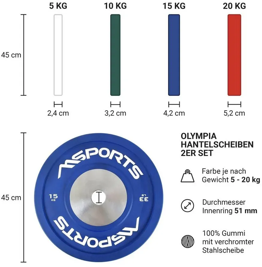 Gewichte Gesamtsortiment Sport Fitness Hanteln + Gewichte Hantelscheiben Leichtathletik & Indoor Sport - EAN:7640314271425 - Unsere Rubber Bumper Plates sind hochwertige Gewichtsscheiben, die speziell für anspruchsvolles Training entwickelt wurden. Die Bumper Plate ist vollgummiert und je nach Gewicht farblich verschieden. Die hochwertige Gummi Ummantelung macht die Gewichtsscheibe strapazierfähig und widerstandsfähig gegenüber Stössen und Schlägen. Die Bumper Plate ist auch ideal für das Dropping der Gewichte geeignet, wie es beispielsweise beim Cross Fit oder Gewichtheben praktiziert wird. Die Ummantelung absorbiert den Aufprall effektiv und schützt zusätzlich den Boden vor Beschädigungen. Mit einem Innendurchmesser von 51 mm passt diese Bumper Plate auf Standard Hantelstangen und ermöglicht ein einfaches Auf- und Abbauen der Gewichte. Der Stahlkern sorgt für eine hohe Stabilität und gleichmässige Gewichtsverteilung, was zu einem ausgewogenen Trainingserlebnis führt. - gefunden von Kelkoo Dieses 20 kg Olympia Hantelscheiben-Set aus Gusseisen für 49.90 Euro ist eine robuste und langlebige Option für ambitionierte Sportler. ![]() ![]()