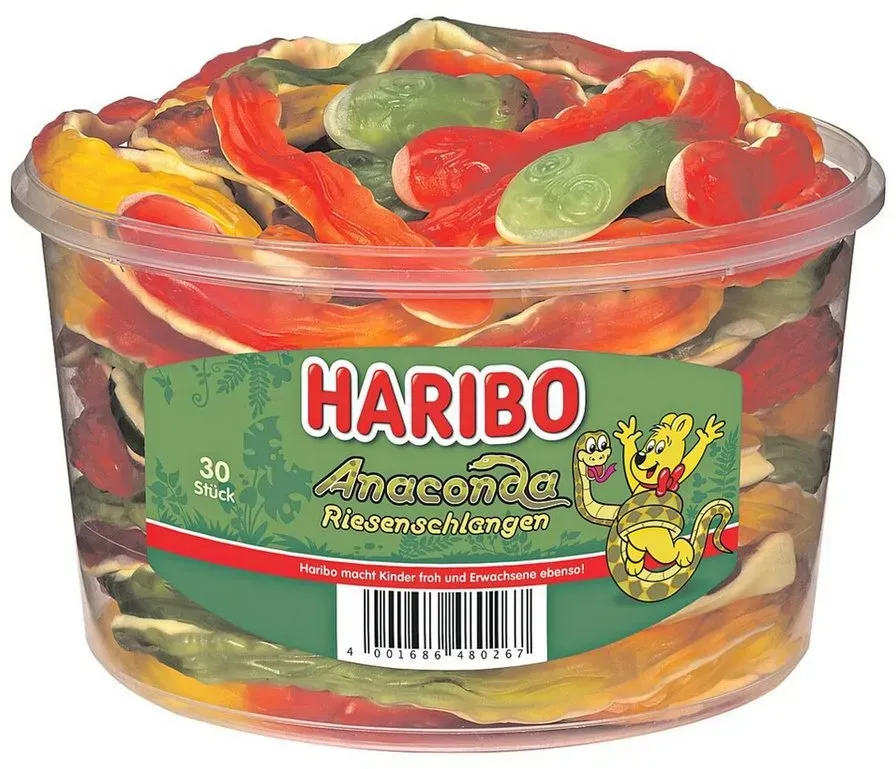 Bücher Lifestyle - - Eine extra lange Nascherei. Mit 35 cm Länge und 45 g Gewicht sind die HARIBO Anaconda Riesenschlangen wirklich XXL. Dieser Stückartikel ist eine Kombination aus Fruchtgummi und Schaumzucker und in den Geschmacksrichtungen Saftorange/Erdbeere, Himbeere/Erdbeere, Himbeere/Zitrone in der Runddose erhältlich. - Versandkostenfrei: false - Sale: true - - - bei Büroshop24 - gefunden von shopping24 ![]() ![]() Haribo Anaconda - Riesenschlangen 30 eBay Stück in der Dose 1,2kg