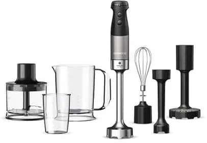 Kenwood - EAN: 5011423008349 - Der Triblade XL Pro Stabmixer ermöglicht schnelles, müheloses Mixen und exzellente Ergebnisse mit dem TribladeTM XL Mixstab. Nutze Techniken mit einer Vielzahl von zusätzlichen Zubehörteilen zum Quirlen, Zerkleinern, Emulgieren und Pürieren. Leistungsstarker 1200 Watt Motor Unser leistungsstarker Stabmixer, mit mehr Leistung für schwierige Zutaten. Mehr Geschwindigkeit Variable Geschwindigkeiten für exzellente Ergebnisse. TribladeTM System Breite Edelstahl-Glocke ( 80 mm) und langer Schaft (20 cm) für das optimale Mixen. Premium Optik & Haptik Mit glänzender Oberfläche des Schaffts. SuregripTM Handgriff Für sicheren Halt und eine komfortable und einfache Nutzung. Einfache Drehbefestigung Schnelles und einfaches Wechseln der Komponenten. überhitzungsschutz Das Gerät schaltet sich automatisch aus, bevor es überhitzt. Lassen Sie das Gerät abkühlen, bevor Sie es wieder benutzen. Spülmaschinenfeste Teile Bitte Hinweis in der Gebrauchsanweisung beachten. - bei saturn.de - aus Yadore Produktdaten ![]() KENWOOD Triblade XL Pro HBM80.327BK, leistungsstarker Pürierstab mit Zubehör-Set, stufenlose Geschwindigkeit, Turbofunktion, Stabmixer Schwarz/Anthrazit (1200 Watt, 500 ml Zerkleinerer, 600 ml Mix- und Messbecher)