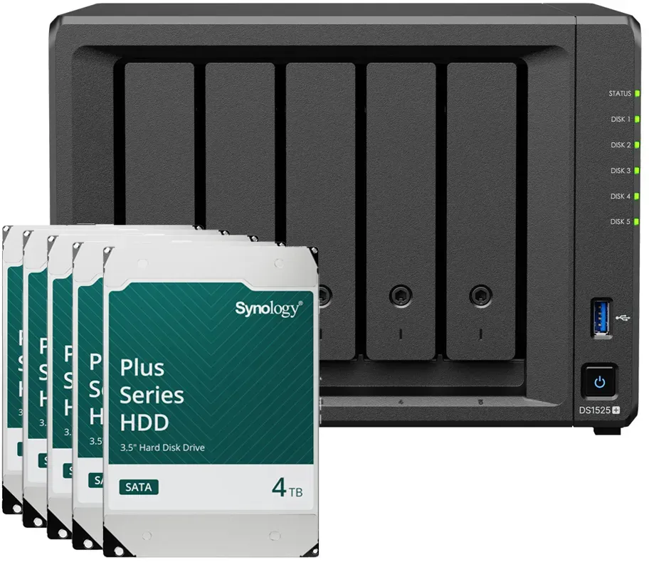 sofort ab Lager / 24h-Service möglichSynology DS1525+ 20TB Plus HDD NAS-Bundle NAS inkl. 5x 4TB Synology Plus 3.5 Zoll SATA Festplatte