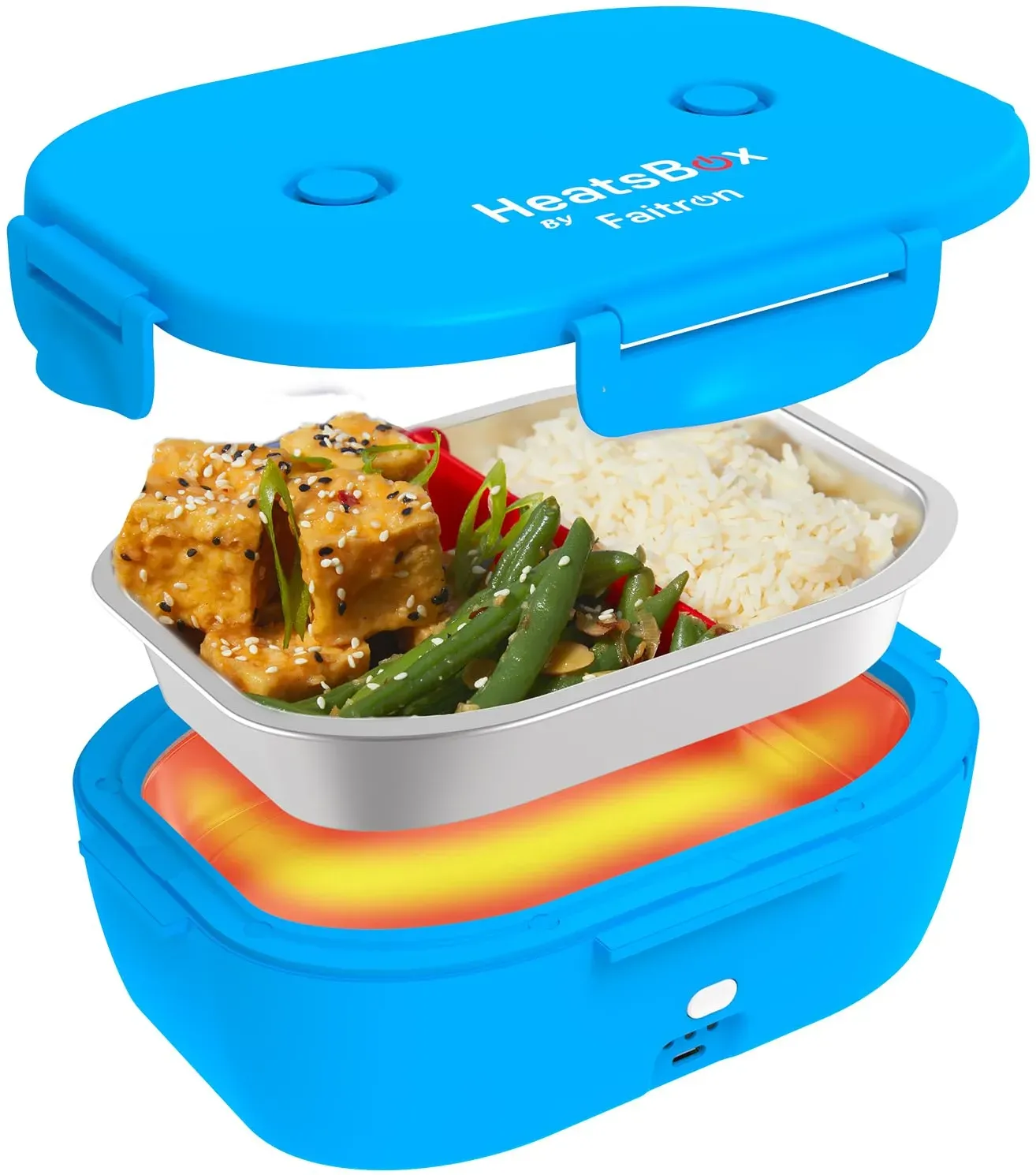 Auf Lager Versand durch AmazonFaitron HeatsBox Go Light ? Beheizbare Lunchbox für Kinder, 540-ml-Edelstahlbehälter, integrierter Akku (100 W) und App-Steuerung, tragbarer Speisenwärmer für Schule/Reisen - Blue