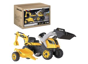 Spiele Spielzeug Lifestyle - - Der Baggerlader JCB 2,4 GHz von JAMARA ergänzt die große Baumaschinen-Serie um ein weiteres Highlight. Der Bagger wurde vom Hersteller offiziell lizenziert und verfügt über Spielmöglichkeiten die der originalen Baumaschine sehr nahe kommen. Der Bagger ist über die 2,4 GHz Fernsteuerung in alle Richtungen fahrbar und auch die Funktionen des robusten Frontladers mit heben, senken und abkippen, sind per Kopfdruck an der Fernsteuerung bedienbar. Die realistischen, einziehbaren Seitenstützen und der klappbare Heckbagger funktionieren manuell. Die Sound-Palette des Baggerladers reicht vom realistischen Motorsound (abschaltbar) über die Hupe bis hin zum Rückfahrwarnsound. Der JCB Baggerlader im Maßstab 1:20 verfügt über einen Auto-Standby-Modus wenn längere Zeit nicht gespielt wird. Alle diese Kriterien machen den JAMARA JCB Baggerlader zum unverzichtbaren Helfer auf jeder Wohnzimmer- und Gartenbaustelle. Erforderlich 6 Mignonbatterien, nicht im Lieferumfang enthalten., Produktdetails: Farbbezeichnung: gelb, Material: Kunststoff, Frequenz Funkfernsteuerung: 2,4 GHz, Lieferumfang: Fernsteuerung, Anleitung, Maße Gewicht: Maßstab Fahrzeuge: 1: 20, Breite: 14 cm, Tiefe: 61 cm, Höhe: 17 cm, Gewicht: 860 g, Hinweise: Altersempfehlung: ab n, Warnhinweise: ACHTUNG! - Benutzung unter unmittelbarer Aufsicht von Erwachsenen., Lieferzustand Batterien / Akkus: Keine Batterien beigelegt, Stromversorgung: Anzahl Batterien: 6 Stk., Art Stromversorgung: Batterien, ... Der Smoby Kinderfahrzeug Traktor Builder Max mit Anhänger ist ein robustes und vielseitiges Spielzeug für kleine Baumeister. ![]() Smoby Kinderfahrzeug Traktor Builder Max mit Anhänger