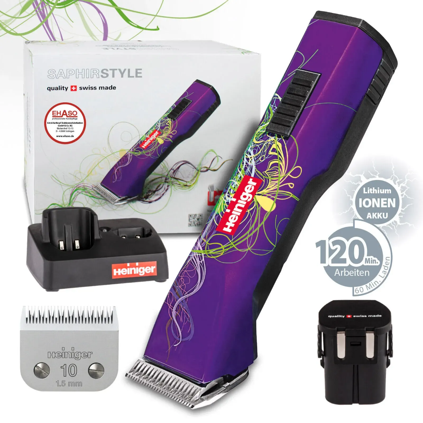 Haarschneider Gesamtsortiment Beauty + Gesundheit Haushalt Beauty + Gesundheit Rasur + Haarentfernung Trimmer + Haarschneider Elektrische Rasierer, Trimmer & Epilatoren - EAN:3700393933134 - Der Saphir Style Haarschneider von Heiniger ist ein professioneller Finishing-Haarschneider, der Ihnen ein perfektes Ergebnis rt. Eine leistungsstarke und innovative Schermaschine. Einmal benutzt, wird die Saphir zu einem unverzichtbaren Arbeitsgerät für die professionelle Schur von Kleintieren. Leiser und leistungsstarker 35-W-Permanentmagnet-Motor. Hochwertiges Ladegerät mit Ladeanzeige, wird mit einer zusätzlichen Box für Akkus geliefert. Zwei hochleistungsfähige Akkus, die mit der neuesten Technologie (Lithium-Ionen) entwickelt wurden, ermöglichen eine Schurdauer von über 120 Minuten bei einer Ladezeit von weniger als 60 Minuten (pro Akku). Grosse Auswahl an austauschbaren Scherköpfen. Ersatzakku optional erhältlich. Einzigartig, stark und langlebig, lautlos, schlank und ergonomisch, ultraleicht im Design und Style. Lieferung mit 1,5 mm Kammaufsatz, Ladestation, 2 Akkus, Öl, Bürste und Bedienungsanleitung. Technische Daten: Motorleistung: 35 W Geschwindigkeit: 2650 Schwingungen/Min Masse: 204 x 50 x 41 mm Gewicht inkl. Akku: 425 g Akkuspannung: 7,4 V Akkukapazität: 1400 mAh. - gefunden von Kelkoo Die Saphir Style Schermaschine mit einem Akku in Kartonbox ist eine elegante und funktionale Wahl für Katzen und Hunde. ![]() Heiniger Schermaschine Saphir Style in Kartonbox mit 1 Akku (Katze, Hund), Tierpflegemittel